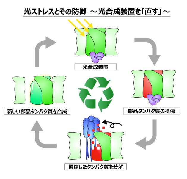 [2] 光合成装置の修復:光化学系IIは光によって損傷を受ける。この損傷は光化学系IIの反応中心であるD1タンパク質に集中することが知られており、損傷したD1タンパク質のみを分解/新規タンパク質合成により入れ換えることで光化学系IIの機能を維持している。この一連の反応は光化学系II修復と呼ばれる。
