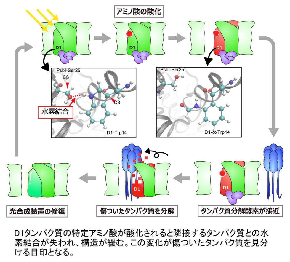 D1タンパク質は光合成装置である光化学系IIのなかで、明反応の中心的な役割を担っており、その反応の結果として活性酸素が生じることがわかっていました。また、一般に活性酸素はタンパク質を酸化させることでダメージを与えることもわかっていました。これらのことから活性酸素の発生場所であるD1タンパク質が真っ先に損傷するのは活性酸素による酸化と推測できます。