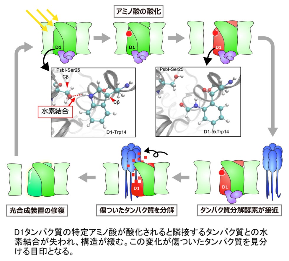 光合成には光が必要ですが、光は同時に活性酸素を生じ、光合成装置を傷つけてしまうことが知られています。光合成装置の光化学系IIはさまざまなタンパク質からなる複合体ですが、その部品であるタンパク質がダメージを受けてしまうのです。植物などの光合成生物は傷ついた部品タンパク質を取り替えるという仕組みを創り上げてきました(光合成装置の修復)[2]。しかし、細胞の中でどのように傷ついた部品タンパク質と無傷の部品タンパク質を見分けているかは謎のままでした。今回の研究では、光合成装置の中でヒューズのような役割をする部品タンパク質に生じるアミノ酸の酸化[3]がきっかけとなり、傷ついたタンパク質が取り除かれ、修復されることが明らかとなりました。