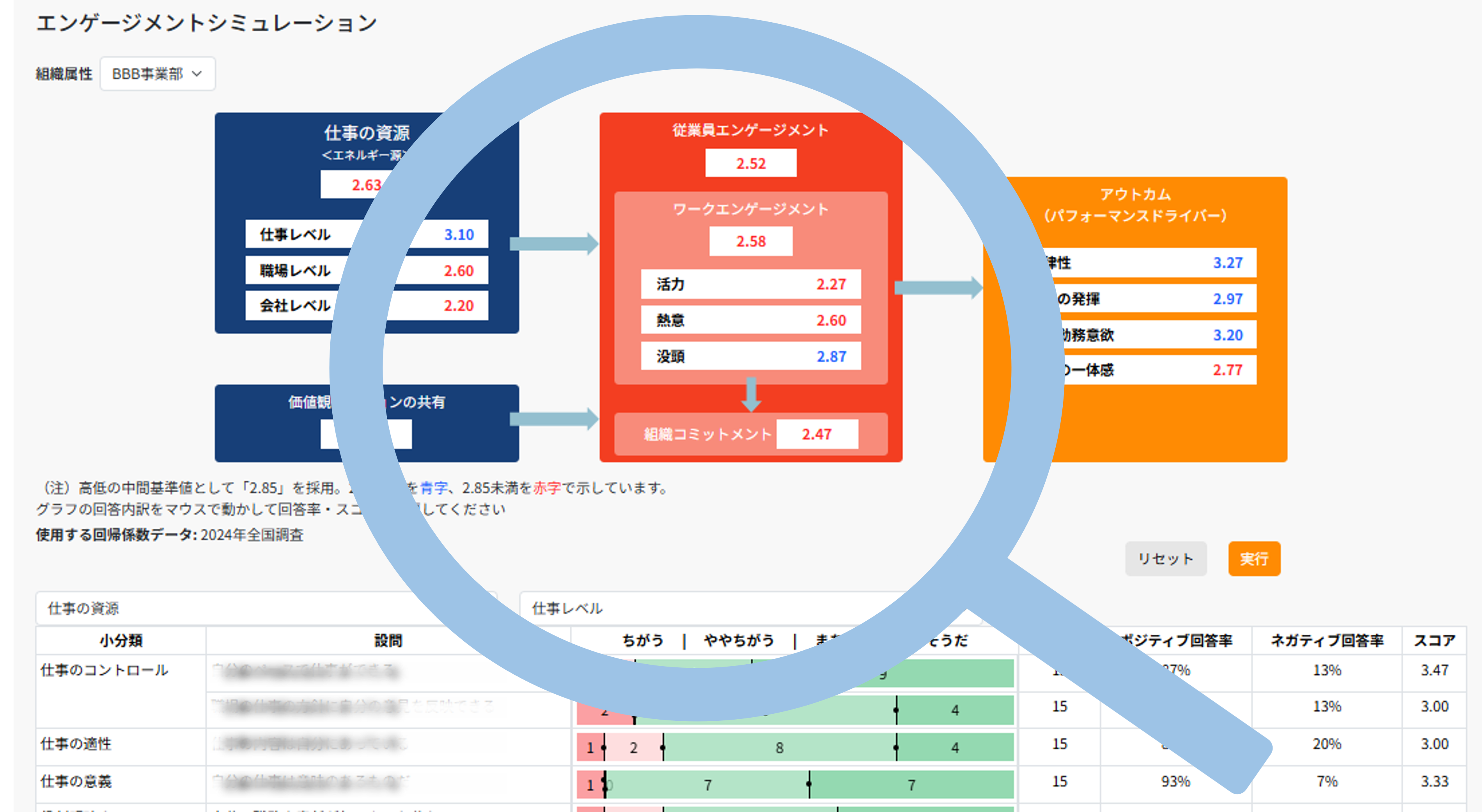 企業内においてエンゲージメントの構造は一様ではなく、部署ごとに課題や影響要因は大きく異なります。今回のアップデートにより、従来は全社単位でしか行えなかったシミュレーションが、組織(部署)単位でも実行可能になりました。