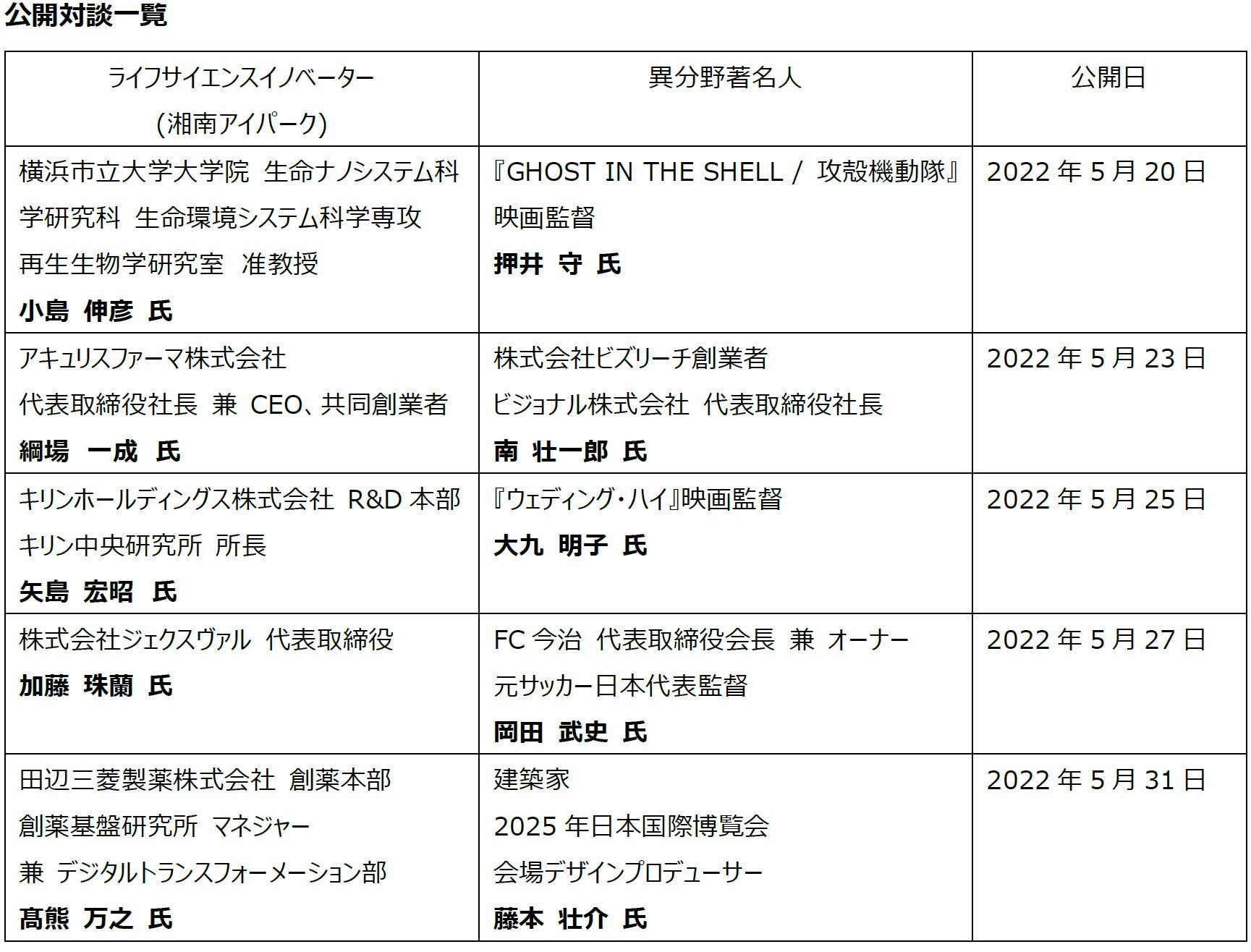 湘南ヘルスイノベーションパーク(以下「湘南アイパーク」)は、湘南アイパークを拠点として挑戦を続ける5名のライフサイエンスイノベーターと、異分野で活躍する著名人らが対談を行う、「FUTURE meets FUTURE イノベーターたちの異分野対談」シリーズを、Forbes JAPAN とのタイアップ企画として開始いたします。
