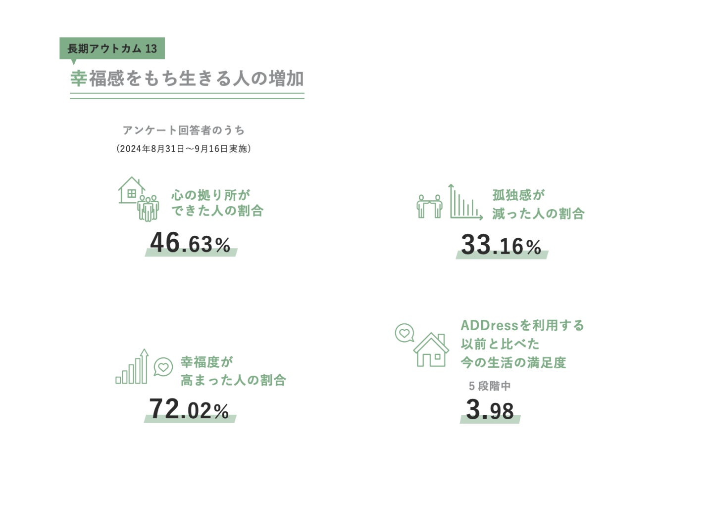 ADDressが事業を通じて最終的に目指すアウトカムが「幸福感をもち生きる人の増加」です。人間は社会性の動物であり、友人関係や社会への帰属意識が幸福感に強く影響すると言われています。ADDressはこの点に着目して、サービスの一環としてコミュニケーションの機会、コミュニティ参画の機会を提供し、会員がそこで得た交流を新たな心の拠り所とし、孤独感を解消することを期待しています。