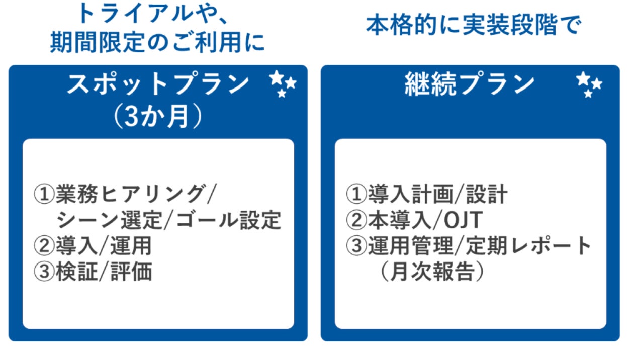 業務調査、要件定義、業務プロセス設計、システム提供、対話シナリオ作成、テスト/公開、運用ルール整備、マテリアル整備、公開後運用など。