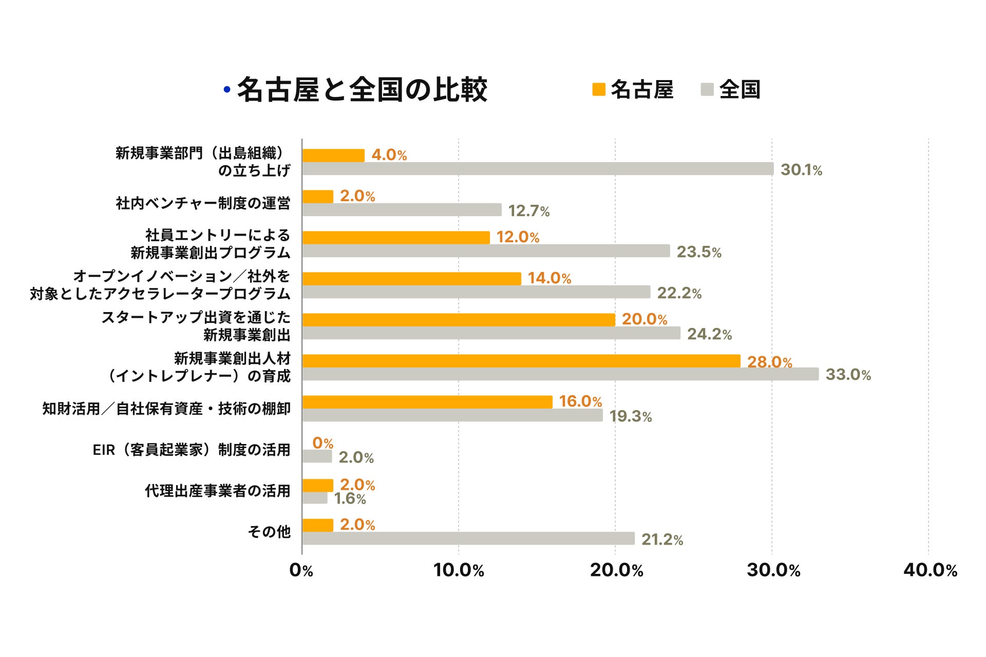 「新規事業創出人材(イントレプレナー)の育成」に取り組まれる事業会社の比率が最も多いのは全国的な傾向ですが、「スタートアップ出資を通じた新規事業創出」「オープンイノベーション/社外を対象としたアクセラレータープログラム」など他社との共創を軸とした取り組みの注目度が高いことが伺えます。