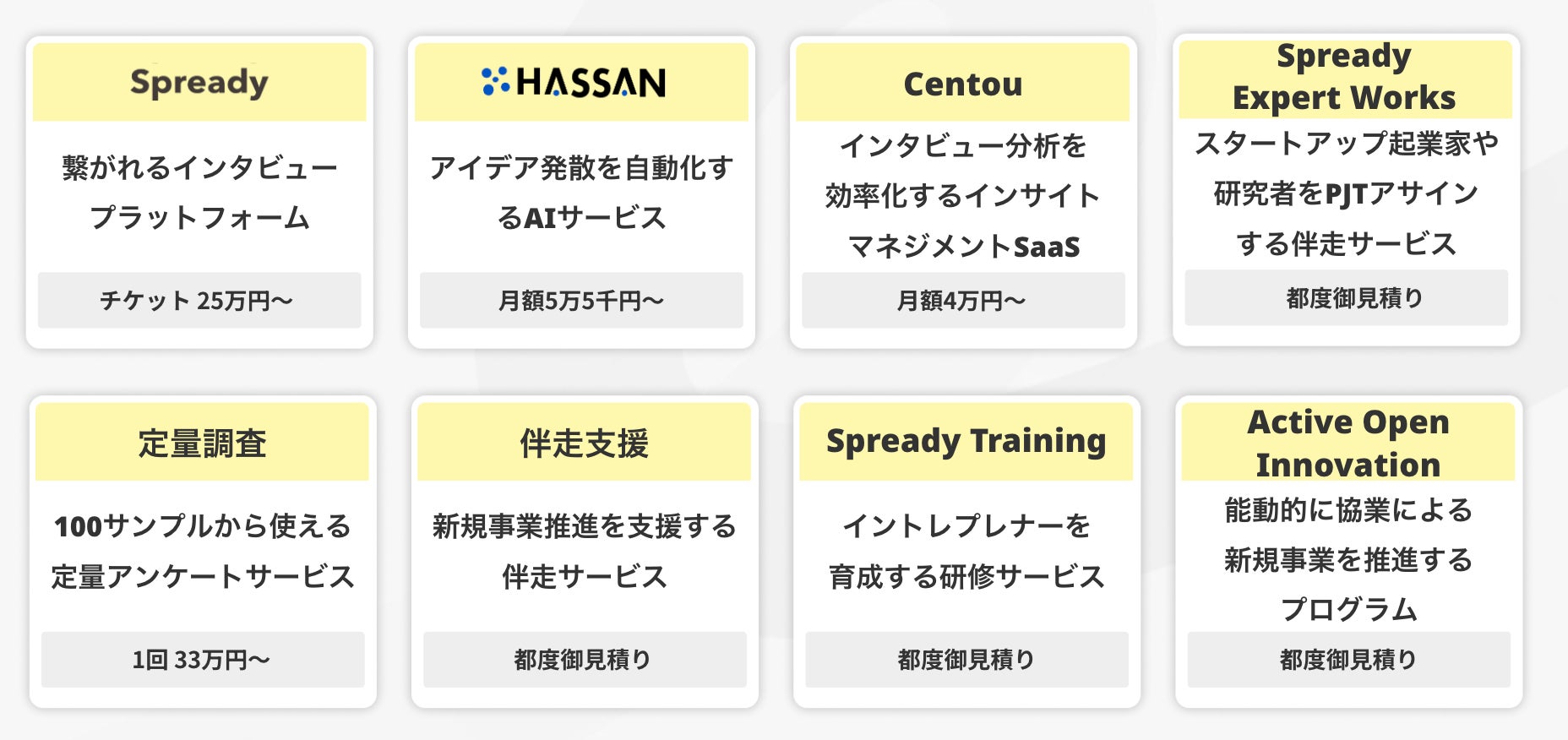 Spready株式会社では、「日本のイノベーションに必要な出会いを、すべてSpreadyから」を掲げ、日本のイノベーションに必要な出会いをワンストップで提供できるプラットフォーム構築に向けて精進してまいります。新規事業のアイディア発想支援、ユーザーヒアリング支援、イノベーション人材研修についてもサポートしております。