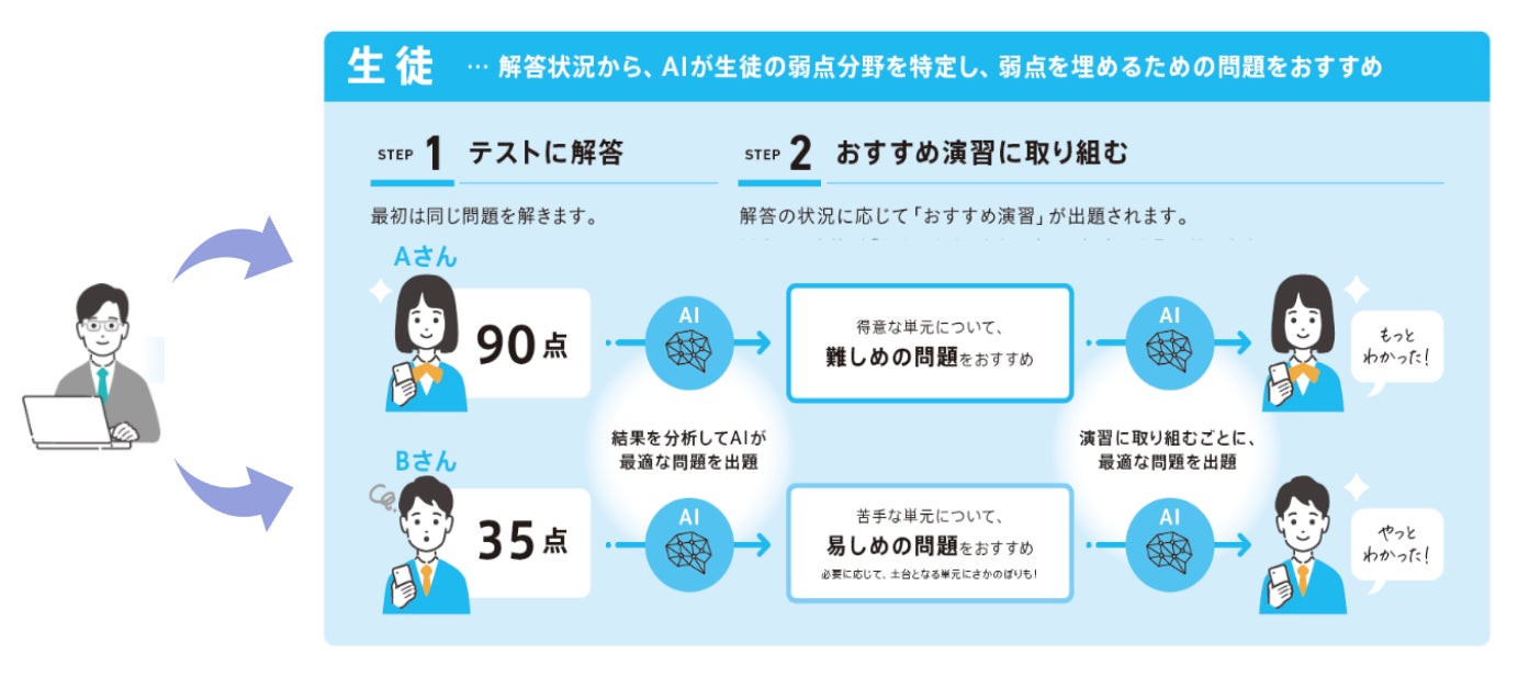 AIが搭載されており、高等学校および中高一貫校で利用できる教育プラットフォーム「Classi」上で利用することが可能です。
