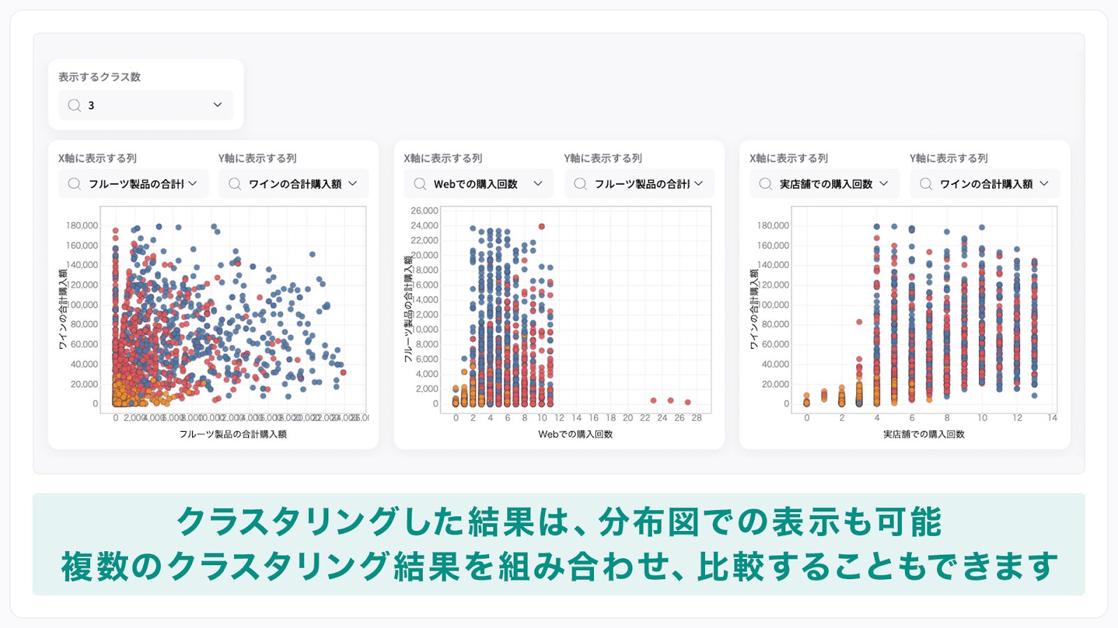 また、クラスタリングした結果は、分布図での表示も可能。複数のクラスタリング結果を組み合わせ、比較することもできます。