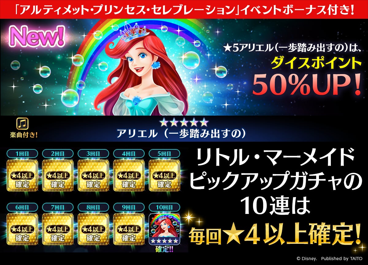 株式会社タイトー(本社:東京都新宿区、以下タイトー)が配信する、ディズニーの音楽ゲームアプリ『ディズニー ミュージックパレード』にて2022年1月17日(月)まで「アルティメット・プリンセス・セレブレーション」記念イベントを開催しています。第3弾のフィナーレとして、本日1月6日(木)15:00から、清水美依紗さんが歌唱する「アルティメット・プリンセス・セレブレーション」の日本語版オリジナルテーマソング「Starting Now 〜新しい私へ」の楽曲ステージが登場。あわせて、ワールド『リトル・マーメイド』より「アリエル」の新たなミュージックライドも追加。同日15:00から、すごろくツアーズを開始しました。