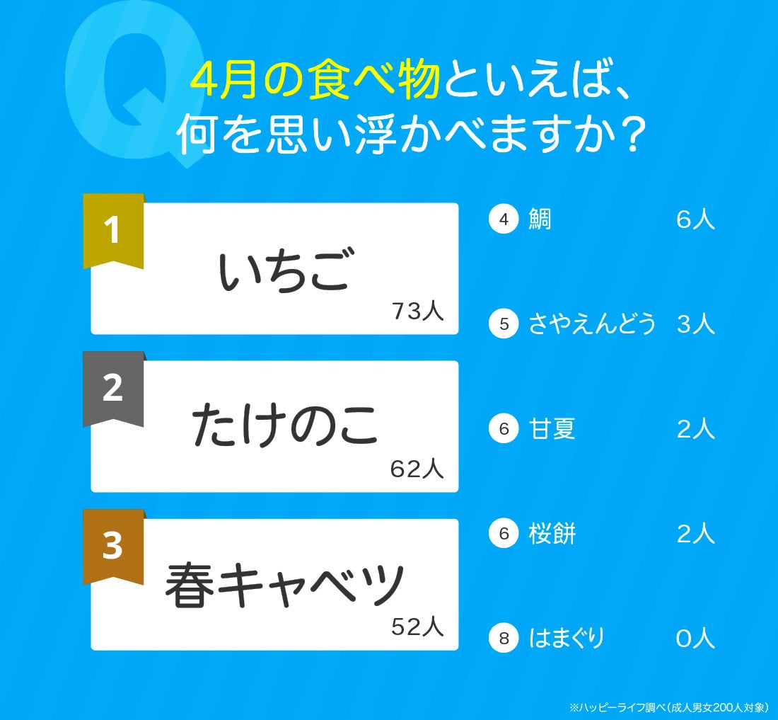 4月の食べ物といえば何を思い浮かべるか聞いてみたところ、1位は「いちご」、2位は「たけのこ」、3位は「春キャベツ」でした。