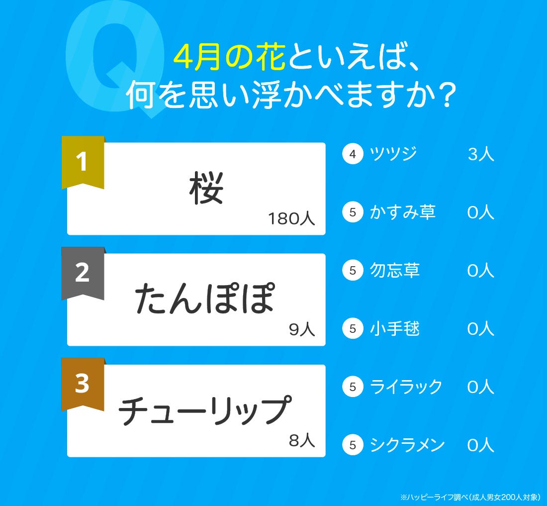 4月の花といえば何を思い浮かべるか聞いたところ、1位は「桜」、2位は「たんぽぽ」、3位は「チューリップ」でした。