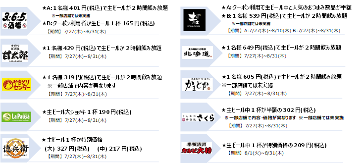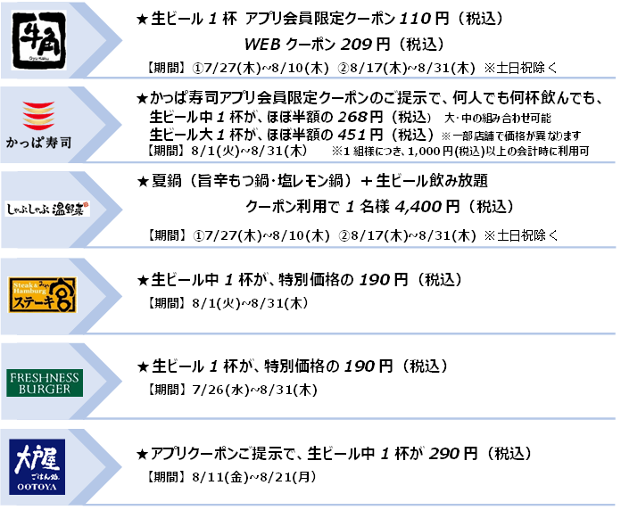 牛角は、生ビール1杯アプリ会員限定クーポン110円(税込)、WEBクーポン209円(税込)。