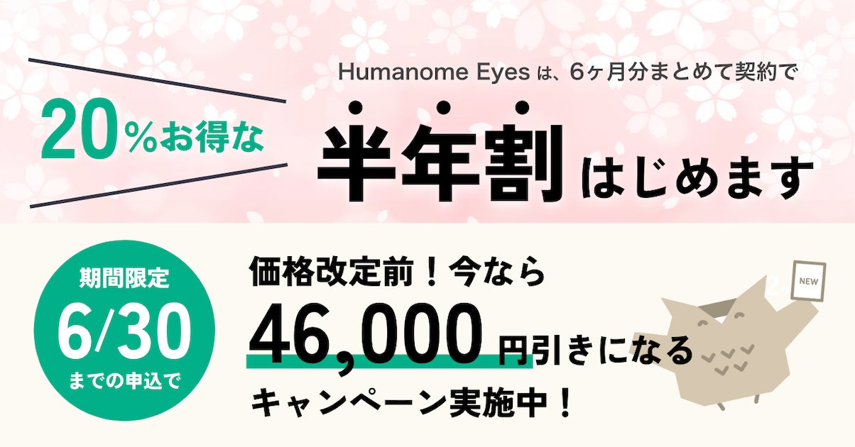 当社は、2023年7月1日ご契約分からHumanome Eyesの価格を改定します。あわせて、今後もお得にご利用いただける「半年割」を開始します。本プランは2023年3月22日よりご提供します。