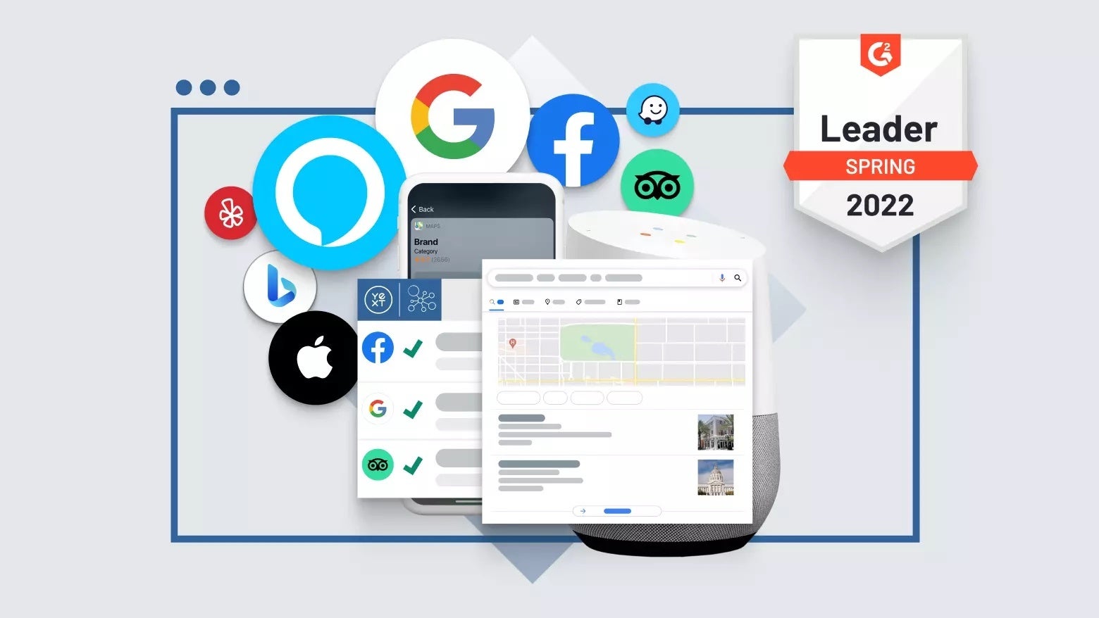Yext は、1億以上の店舗情報をYext上で管理し、Google、Amazon Alexa、Apple Maps、Facebook などのプラットフォームを含む業界最大の連携ネットワークに対して、年間10億以上の更新情報を配信しています。
