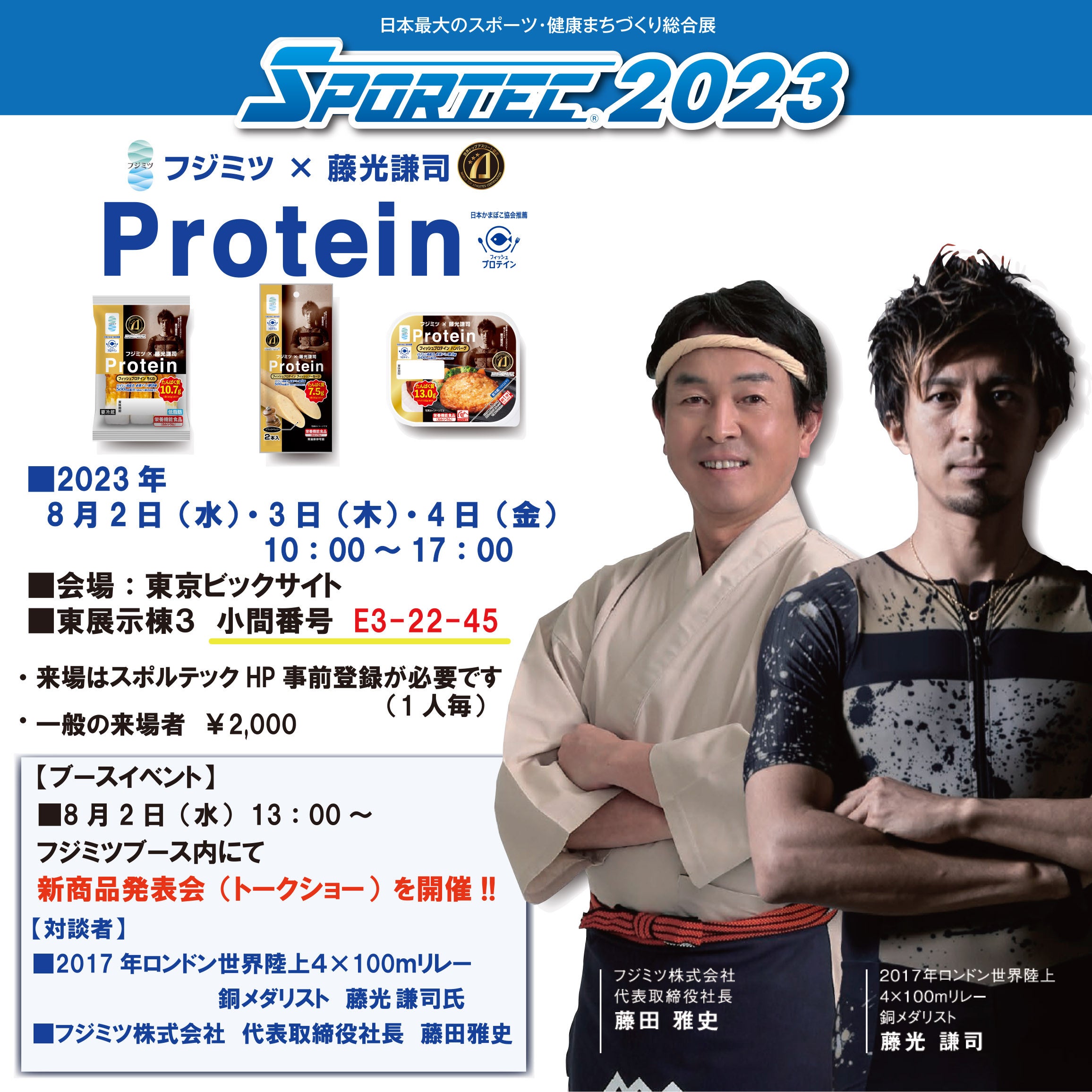 『フジミツ×藤光謙司』として、認定マークのみならず、藤光謙司があしらわれたパッケージでの展開。東京ビックサイトで8月2日から行われる「SPORTEC 2023」のフジミツブースでは新商品発表会(トークショー)も行われます。