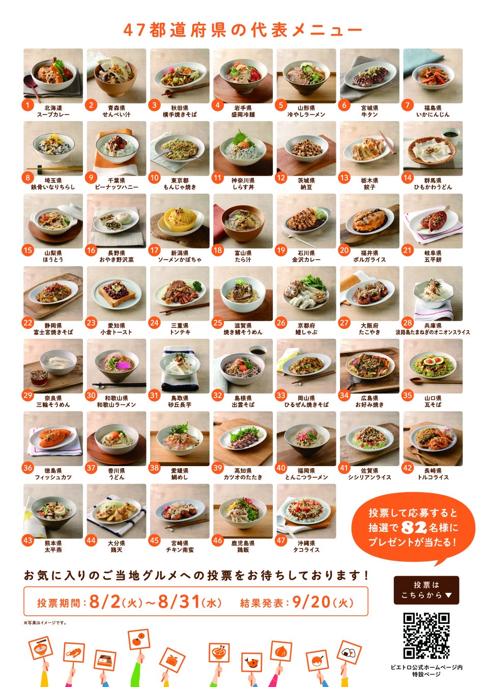 6月に、自社SNS・ファンサイトで『「PATFUTTE フライドオニオン&ナッツ」をかけると、さらにおいしくなりそうなご当地グルメ』を募集し、頂いたアイディア471件の中から各都道府県の代表グルメを選出しました。(リリース2頁目に掲載)本日、8月2日からホームページ内の総選挙特設サイトにて、日本全国の皆さまに投票いただき、第1位を決定します。※総選挙特設サイトはこちら→https://www.pietro.co.jp/products/patfutte2022cp/