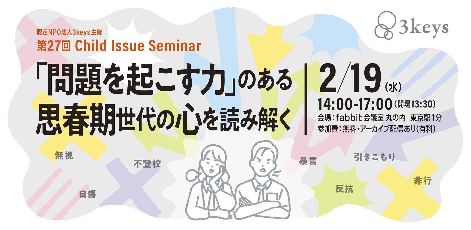 すべてのこどもの権利が保障される社会づくりを目指す認定NPO法人3keys(東京都新宿区、代表理事:森山誉恵)は、2月19日(水)、丸の内エリアの会場において、子ども若者分野に携わる全国の行政関係者や学校・教育関係者を主な対象者とする無料セミナー、第27回Child Issue Seminar「『問題を起こす力』のある思春期世代の心を読み解く」を開催します。
