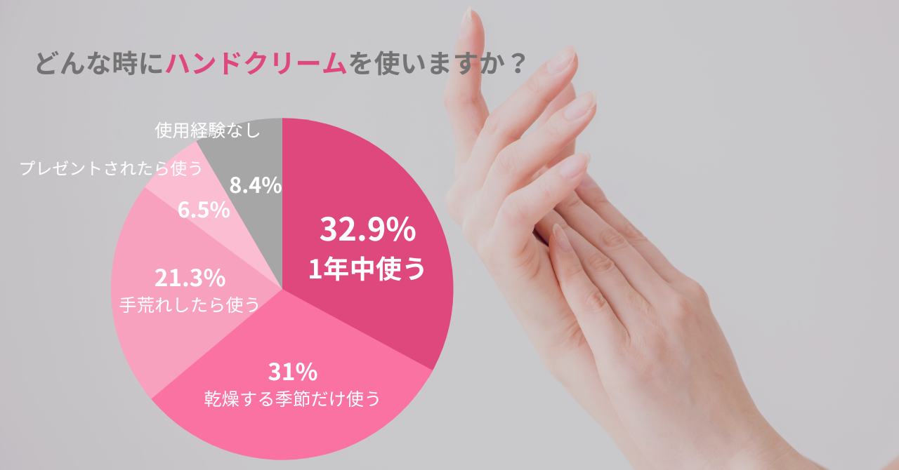 調査の結果、32.9%の女性が「1年中ハンドクリームを使用している」ことが明らかになりました。日常的にハンドケアをすることで、乾燥や手荒れを予防することが可能になります。