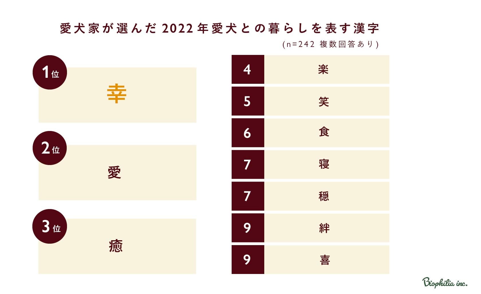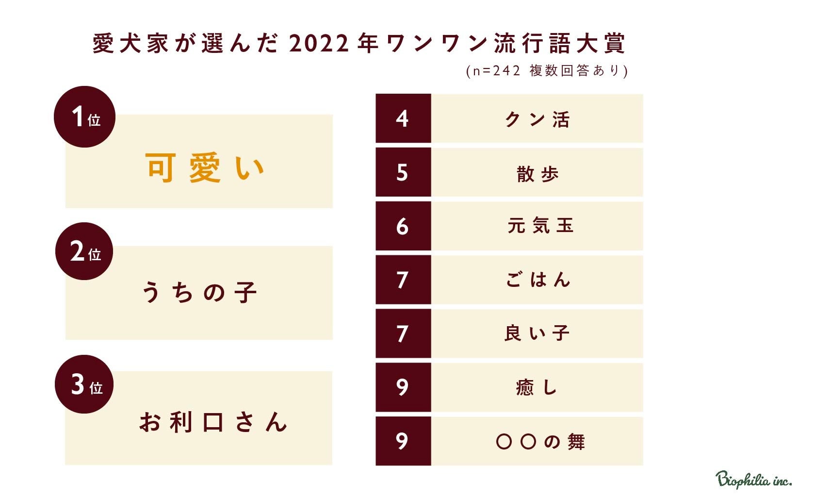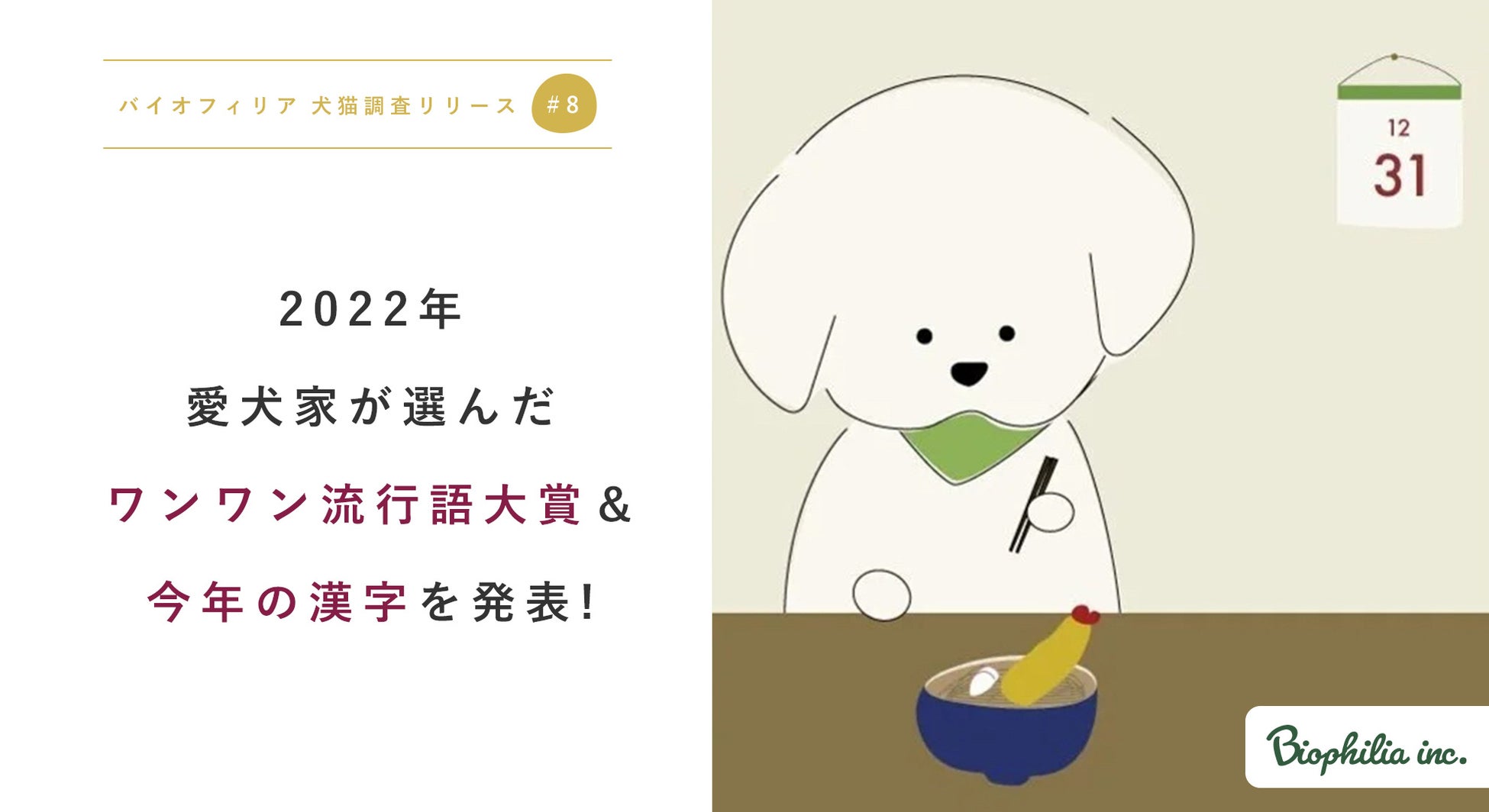 【バイオフィリア犬猫調査リリース#8】2022年愛犬家が選ぶ、ワンワン流行語大賞1位は「可愛い」2位「うちの子」。今年の漢字は「幸」に決定!