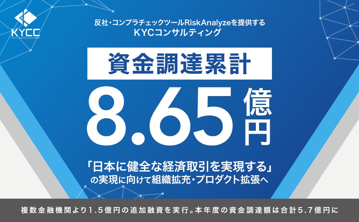 KYCコンサルティング株式会社(本社:東京都千代田区、代表取締役:飛内尚正、以下KYCC)は、株式会社商工組合中央金庫、株式会社日本政策金融公庫、株式会社三井住友銀行、株式会社りそな銀行からデットファイナンスによる総額1.5億円の資金調達を実行しました。本調達により、KYCCは企業向けリスクチェックツール「RiskAnalyze」のさらなる機能強化と市場拡大に向けた取り組みを推進します。