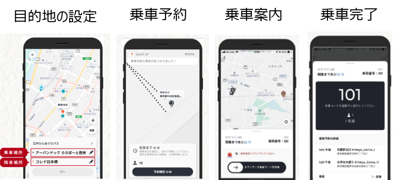 バス利用時、アプリを用い目的地を設定した上で乗車予約し各施設間を移動します。