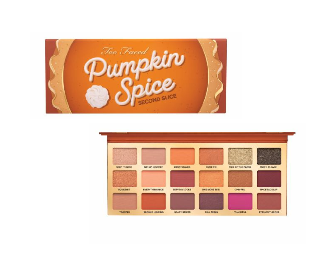 焼きたてのパンプキンパイのようなぬくもり感のあるブラウンとオレンジカラーを中心に、スパイシーなアクセントカラーがちりばめられた捨て色なしのアイシャドウパレット。カジュアルメイクからプレイフルメイクまで組み合わせは無限大!