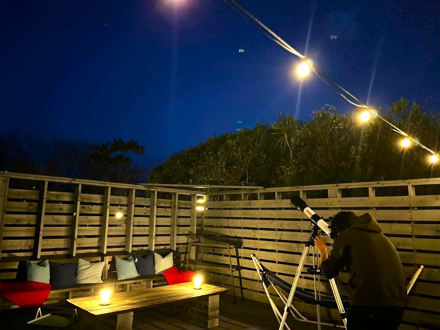 満天の星空の下、大切な人と過ごす特別なひととき。南房総の豊かな自然に囲まれ、心地よい潮風を感じながら、夏の夜空をじっくり眺める天体観測体験が楽しめます。夏の大三角形や星座の名前を覚えながら、幻想的な空の世界に浸ることができます。お子様の自由研究にもぴったりで、学びながら家族みんなで楽しめる時間を提供します。天体観測用のプライベートウッドデッキから、静かな夜空を贅沢に堪能し、心に残るひとときをお過ごしください。