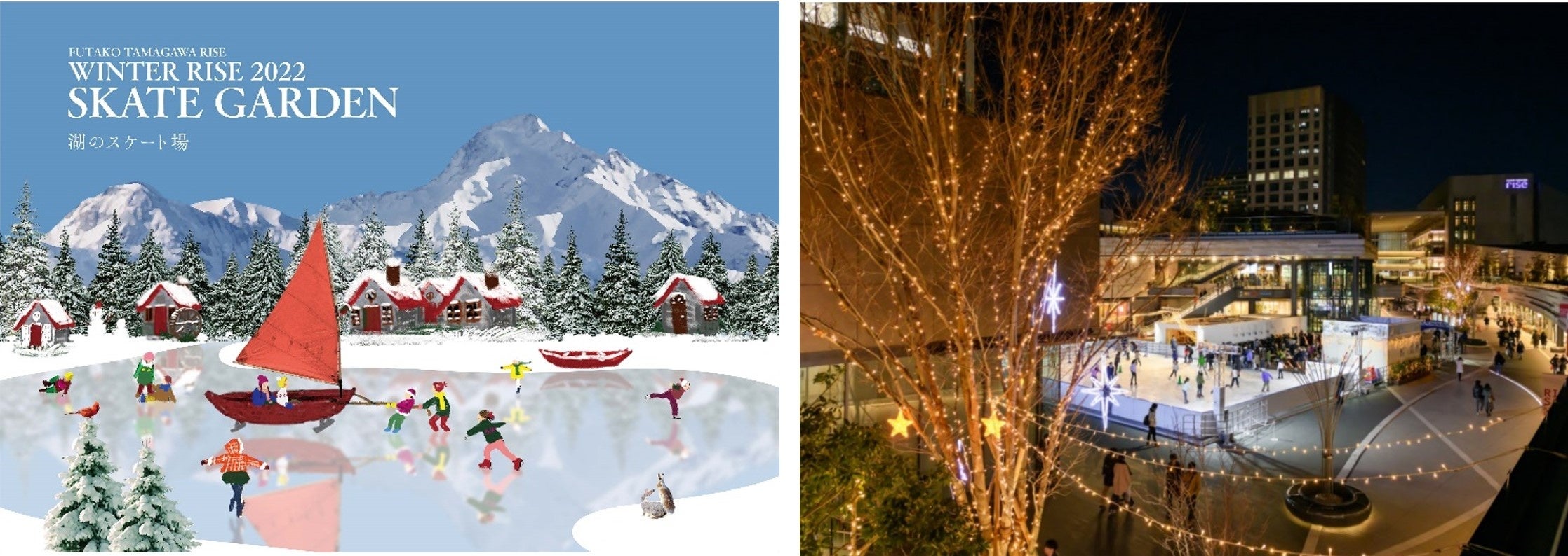 二子玉川ライズ 中央広場には、冬の風物詩「SKATE GARDEN」が登場。「水辺の国」の世界の一つのエリアとして、「湖のスケート場」をテーマに、山のふもとの静かな湖畔に張った氷で子どもたちが遊ぶ様子をイメージしたデザインで展開いたします。さらに夜にはイルミネーションが点灯し、日中とは一味違った幻想的な雰囲気を演出。子どもだけでなく大人もスケートを楽しんで、非日常的な時間を過ごすことができます。