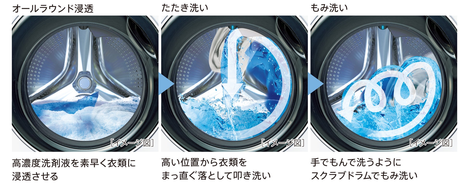 ドラムの静止と回転を繰り返しながら、高濃度の洗剤液を衣類全体に素早く浸透させます。もみ洗いに加えて、高い位置から衣類をまっすぐ落としてたたき洗いを行うことで、食べこぼし汚れや、エリの皮脂汚れもすっきり落として洗い上げます。制御や構造を工夫することで、洗濯時間はクラスNo.1(※10)の約29分を実現しました。12kgの洗濯物をスピーディーに洗濯することが可能です。