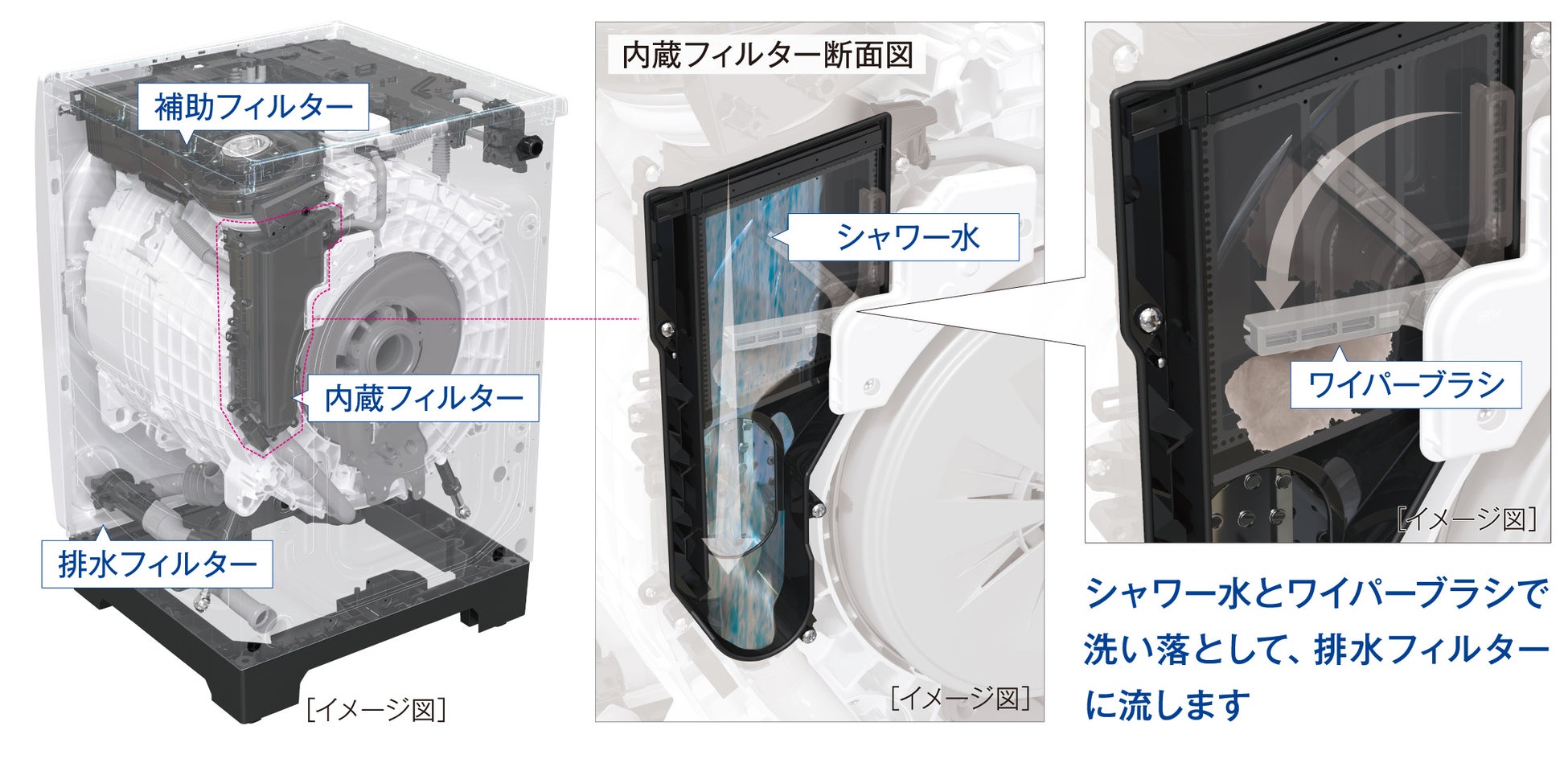 ※2:本体に内蔵した乾燥フィルターのホコリや糸くずをワイパーで掻き落とし、シャワー水で洗い流す方法。2022年10月20日現在。当社調べ。