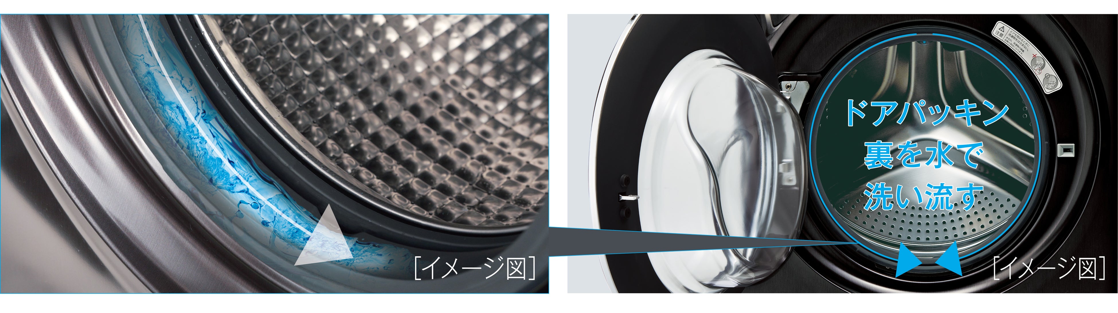 ドア周りのパッキンに残った糸くずや洗剤の泡を、すすぎや脱水を始める前に水で洗い流します。