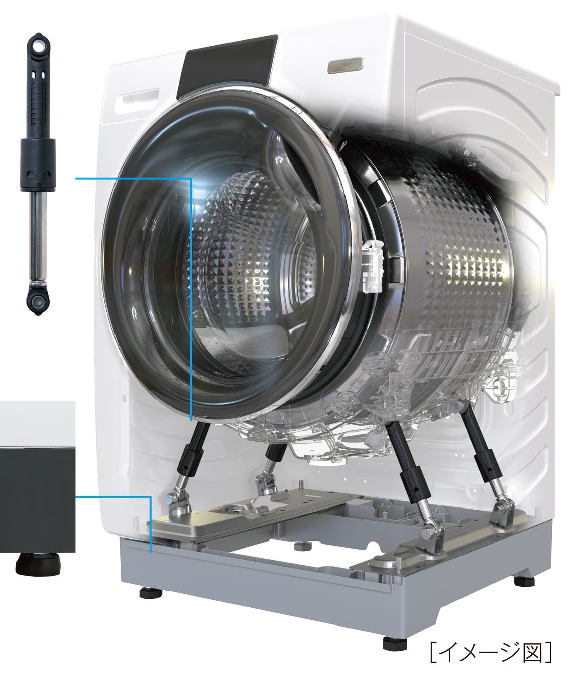 脱水時の音や振動を抑える低騒音モード(※11)を搭載しました。夜間の洗濯乾燥で周囲に配慮したい方、設置環境やお好みに合わせて3段階に設定できます。また、「W伸縮ダンパー」と「防振ゴム付き高さ調整脚」を新たに採用。衣類が偏った時の洗濯槽の揺れや高速脱水時の床への振動を吸収し、低振動・低騒音を実現します。
