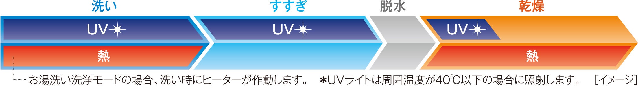 洗濯槽と外槽の間に、除菌(※8)効果が高いUVライトを配置しました。槽内にUVライトを照射し、洗濯中の水をキレイにしながら洗います。さらに、乾燥時の約65℃の温風(※9)やエアウォッシュ使用時(※6)に発生する熱との相乗作用でより効果的かつ手軽に衣類を除菌できます。