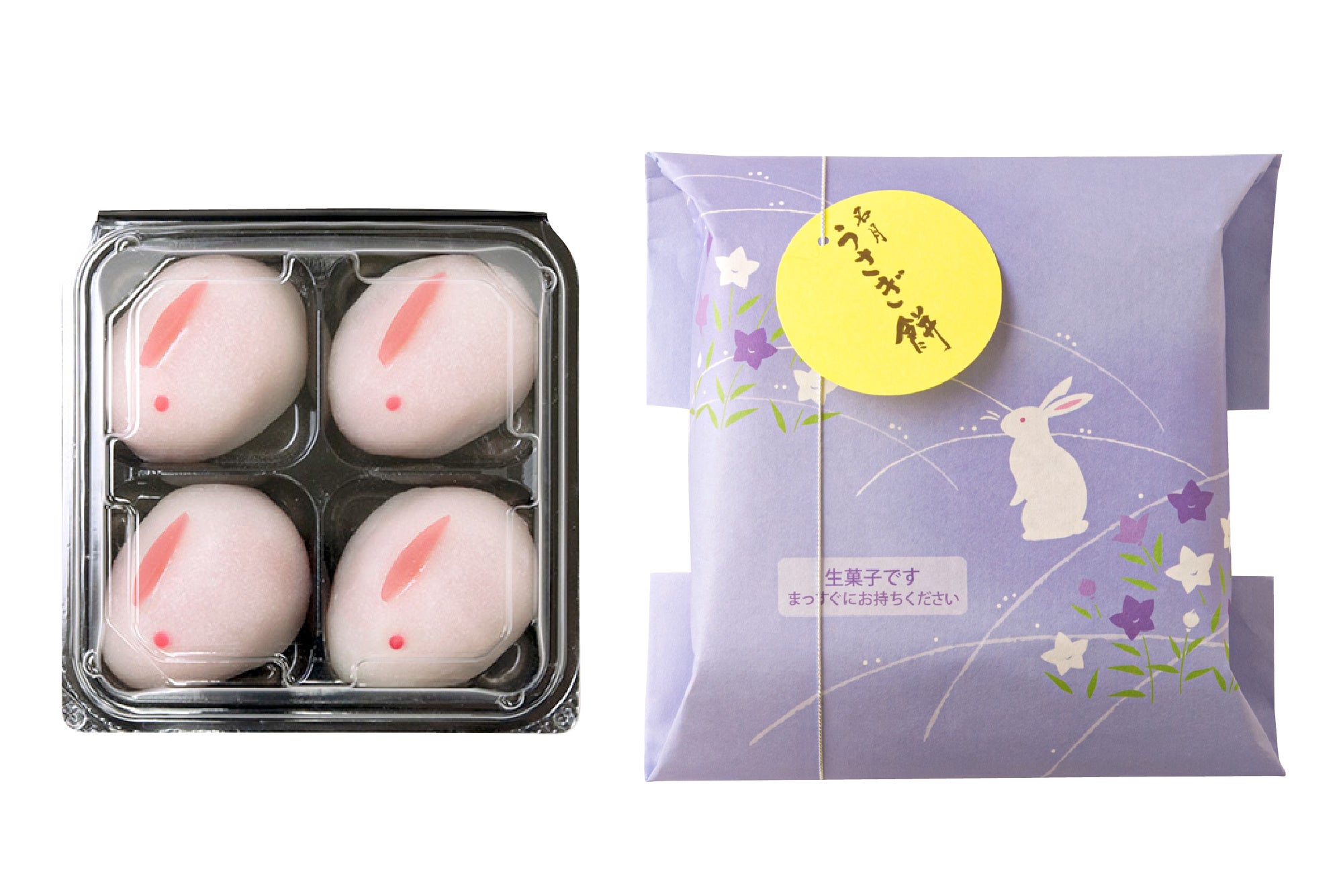 可愛らしいうさぎをかたどった、食べやすい大きさのお餅です。なめらかな紅あんをやわらかな求肥でくるみました。月夜の野原に遊ぶうさぎに、秋の七草・すすきと桔梗をあわせた意匠の特製紙袋で包み、まんまるお月さまの銘入りタグをつけたパッケージ。ちょっとしたお茶の時間にもお手頃な4個入です。