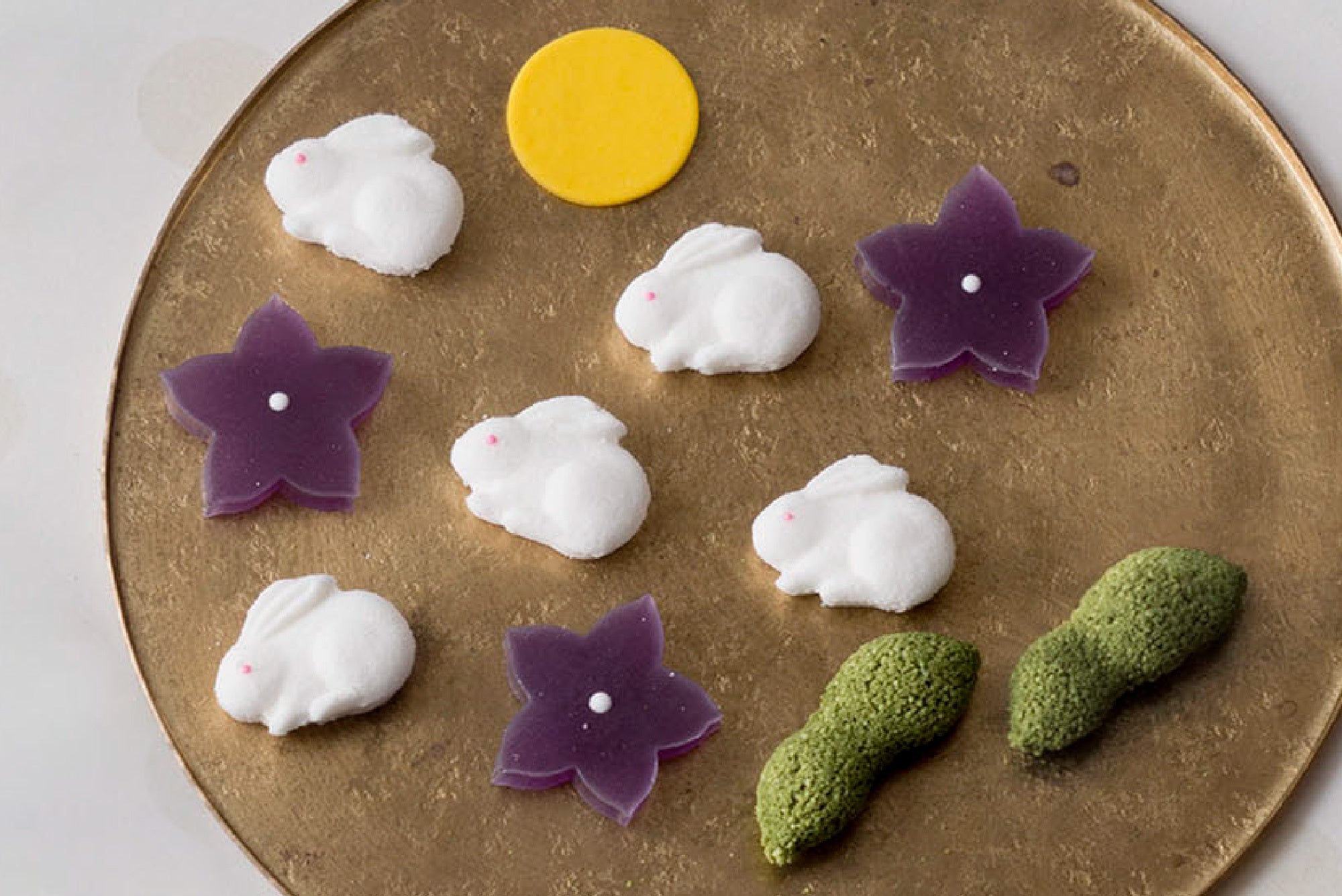 落雁の「うさぎ」はぷっくりと愛らしく、枝豆をかたどった「名月」は豆の粉を用いた香ばしい味わい。ほのかに透き通るコハクの「桔梗」、キザトの満月などを、秋の月夜の情景になぞらえて詰め合わせました。枝豆は秋の豊かな収穫と、月夜に照らされるなだらかな山々をも表現しています。