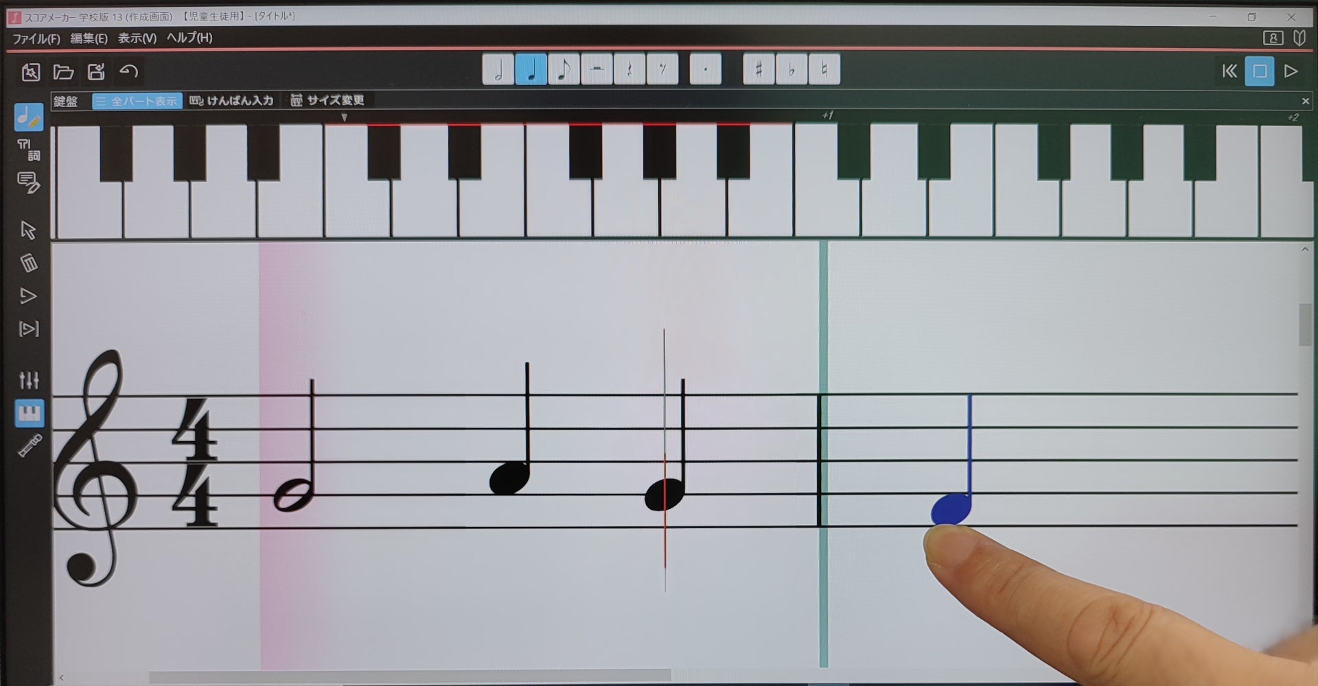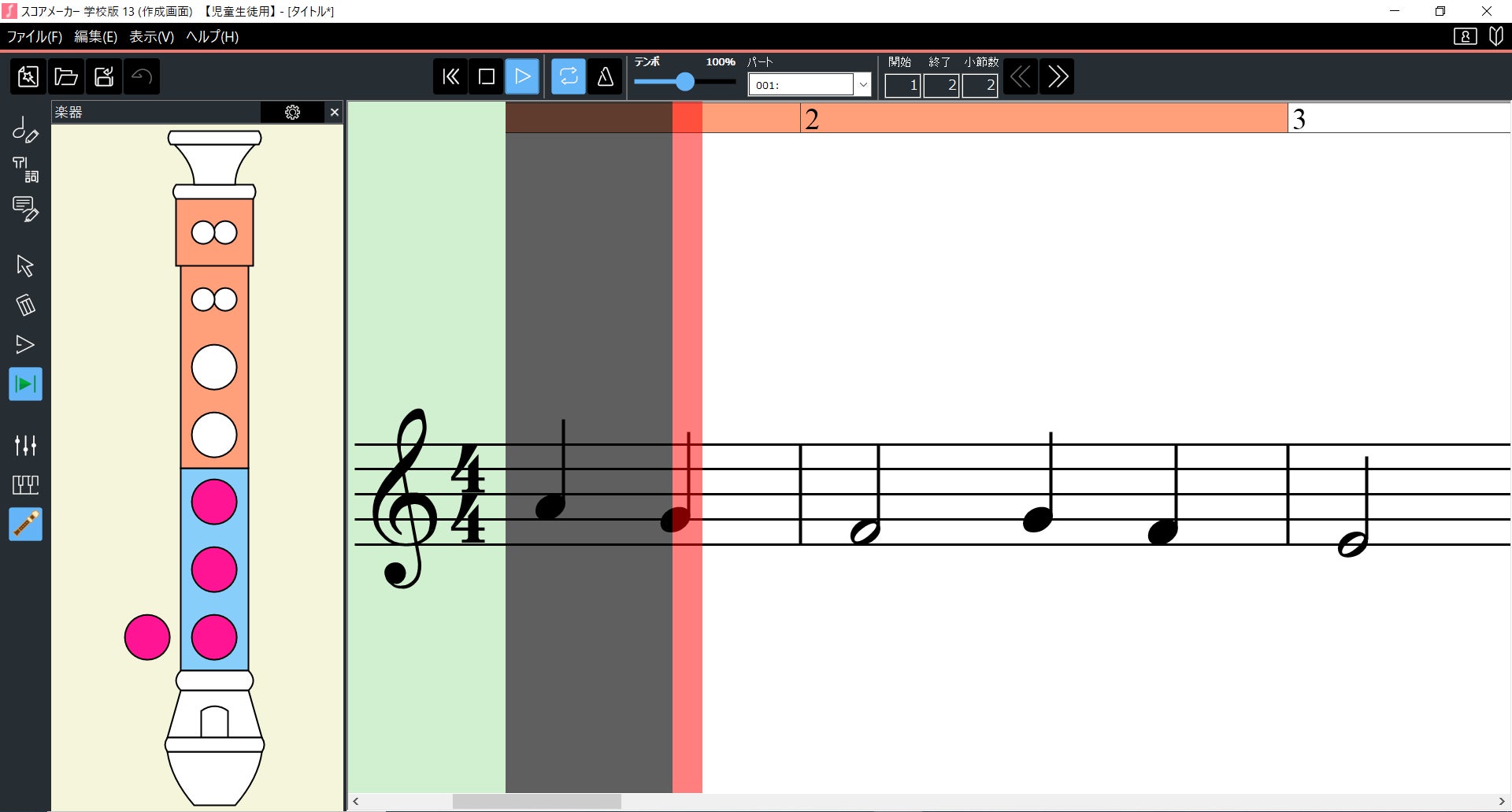 スコアメーカーは楽譜作成だけでなく、練習に便利な機能も搭載しています。楽器パネルには、演奏に合わせてリコーダーや鍵盤ハーモニカの運指が表示できます。また練習モードでは、指定した範囲を繰り返し練習できます。