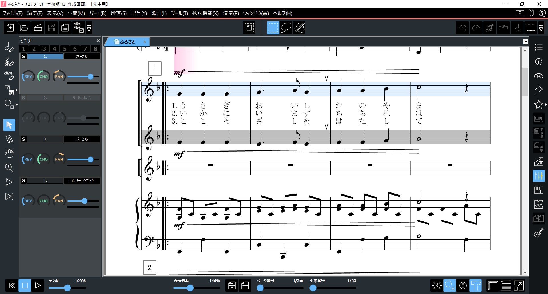 「スコアメーカー」は、世界最高レベルの楽譜認識機能と、本格的な楽譜作成機能を兼ね備え、1995年の発売以来多くの音楽愛好家の方々にご愛用いただいております。スコアメーカーに学校専用の機能を追加した「スコアメーカー 学校版」は、楽譜作成以外にも、練習用パート音源の作成や、電子黒板での楽譜の提示など様々な用途で音楽の授業にご活用いただいております。