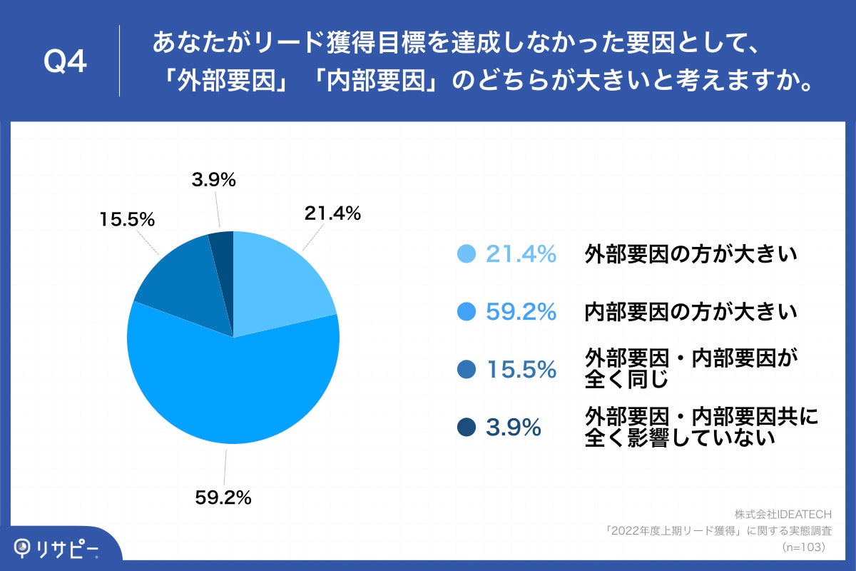 「Q4.あなたがリード獲得目標を達成しなかった要因として、「外部要因」「内部要因」のどちらが大きいと考えますか。」(n=103)と質問したところ、「外部要因の方が大きい」が21.4%、「内部要因の方が大きい」が59.2%という回答となりました。