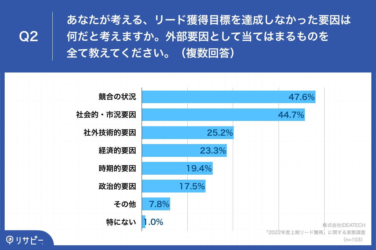 「Q2.あなたが考える、リード獲得目標を達成しなかった要因は何だと考えますか。外部要因として当てはまるものを全て教えてください。(複数回答)」(n=103)と質問したところ、「競合の状況」が47.6%、「社会的・市況要因」が44.7%、「社外技術的要因」が25.2%という回答となりました。