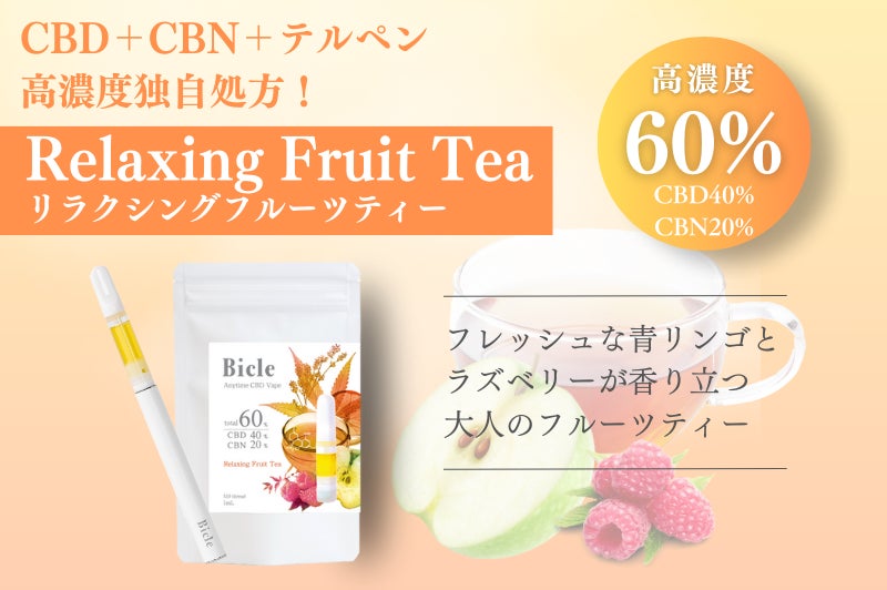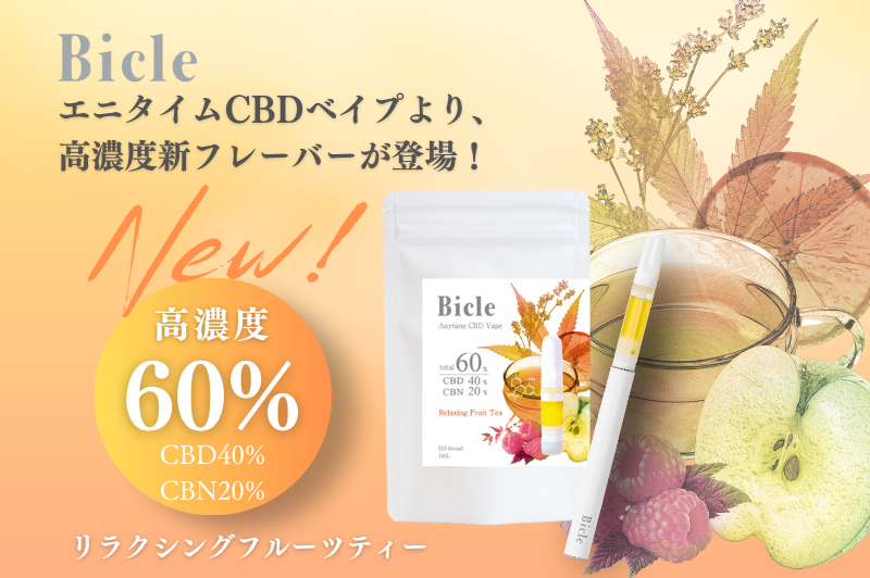 2024年1月17日(水)より、医療機関取扱CBDブランド「BicleエニタイムCBDベイプ」シリーズから、高濃度60%新フレーバー『リラクシングフルーツティー』の予約販売を開始。