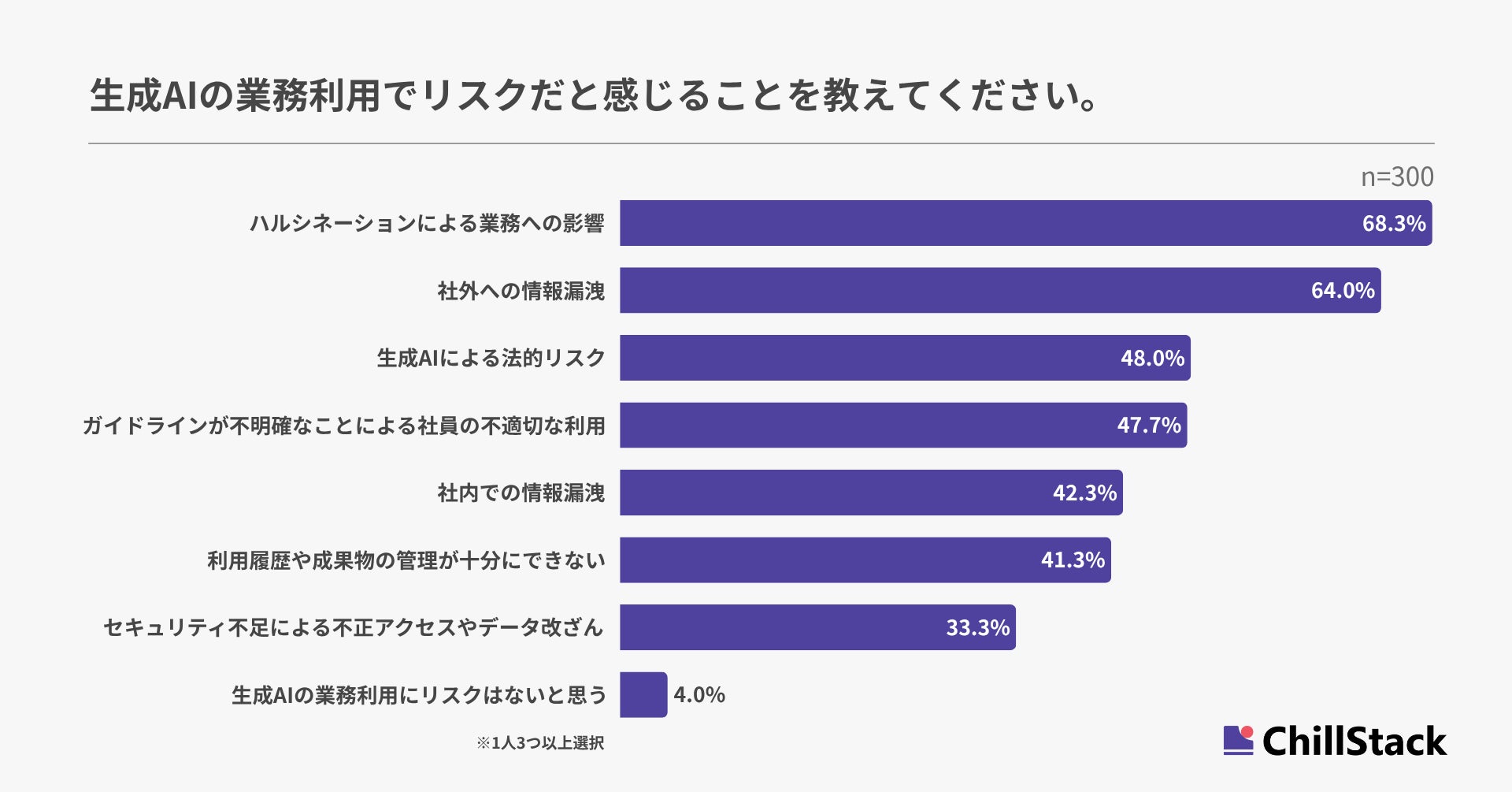 AIを用いた高精度な不正検知サービスやサイバーセキュリティサービスを開発・提供している株式会社ChillStack(本社:東京都渋谷区、代表取締役:伊東 道明、以下「ChillStack」)は、企業の情報システム部門の生成AI導入担当者を対象に、「企業における生成AI利用に関するアンケート」を実施し、300名から回答を得ました。