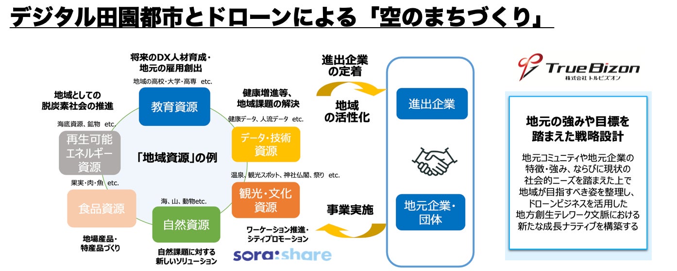 トルビズオンはソラシェアにより、ドローンが飛ぶ地点を3次元のドメイン(住所)で管理し、「地権者合意」をつなぎ合わせることで、ドローン配送用の空の道をつくるプロジェクト「Sky:Road」を提供しています。この事業活動を通して、2022年国が主導しているデジタル田園都市構想におけるドローン空路整備に不可欠な、空域のデジタルツインを構築することをミッションにしています。