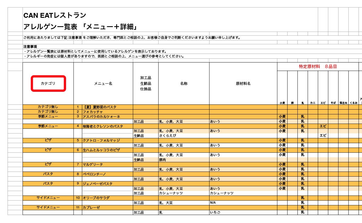 Excelファイル等で出力できるアレルギー表にもカテゴリが反映されます。カテゴリごとにメニューが並ぶので、調べたいメニューを簡単に見つけることができます。