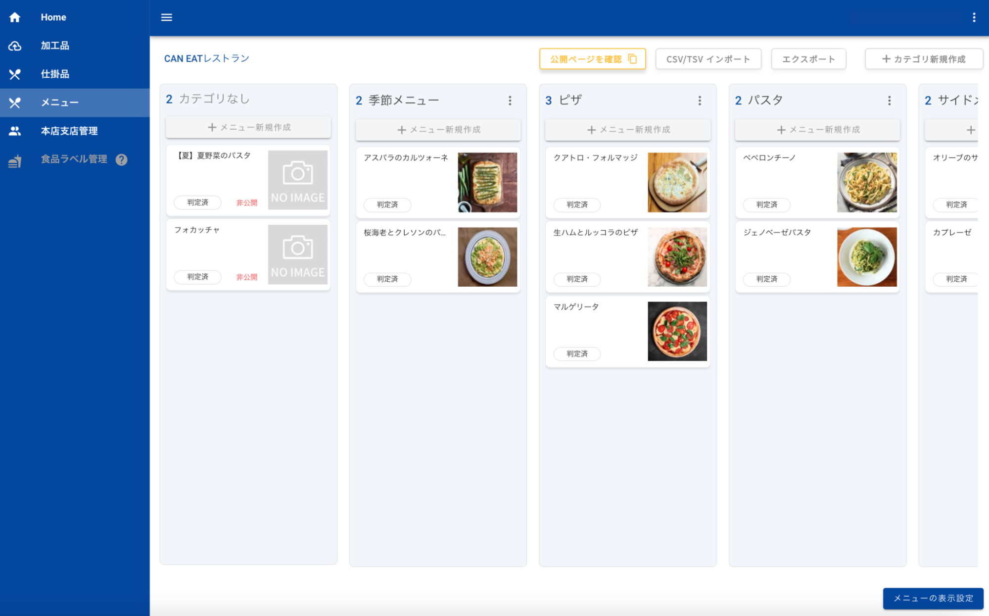メインメニュー・サイドメニュー・デザートなど必要なカテゴリを自由に設定。アレルギー情報のチェックがますます楽に