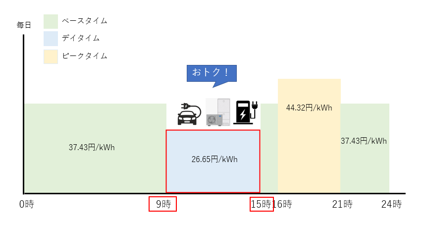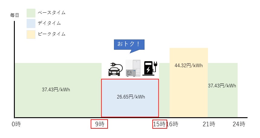 再生可能エネルギー(特に太陽光発電所が発電した電気)(※1)拡大により市場価格が低減した時間帯を最大限有効活用し、昼間の時間帯(デイタイム)の従量料金単価をお安く設定することで、昼間にEV・PHEVを充電するお客さまや電気温水器などの使用を昼間へシフトしたいお客さまが、電気をおトクにご利用いただけます。