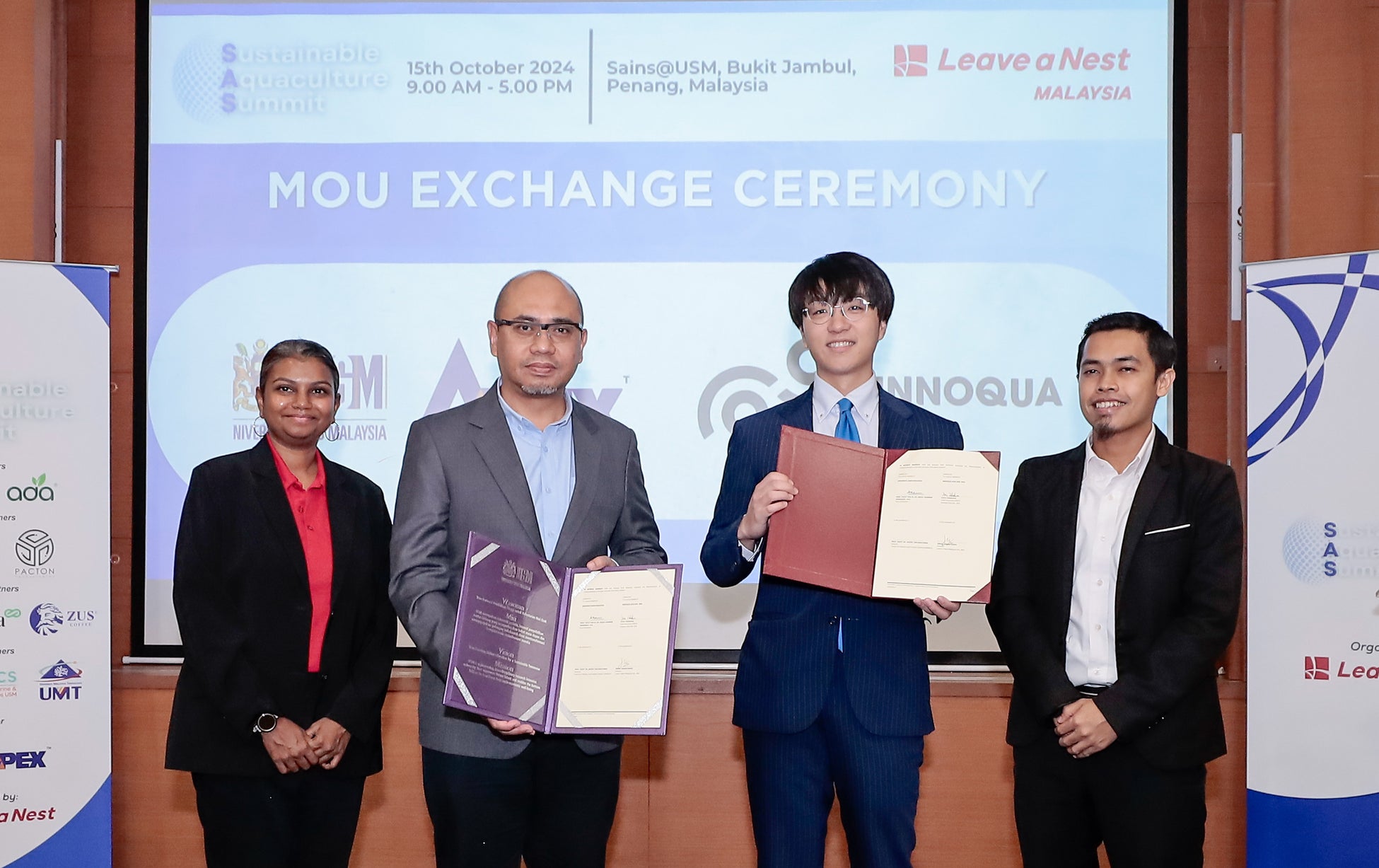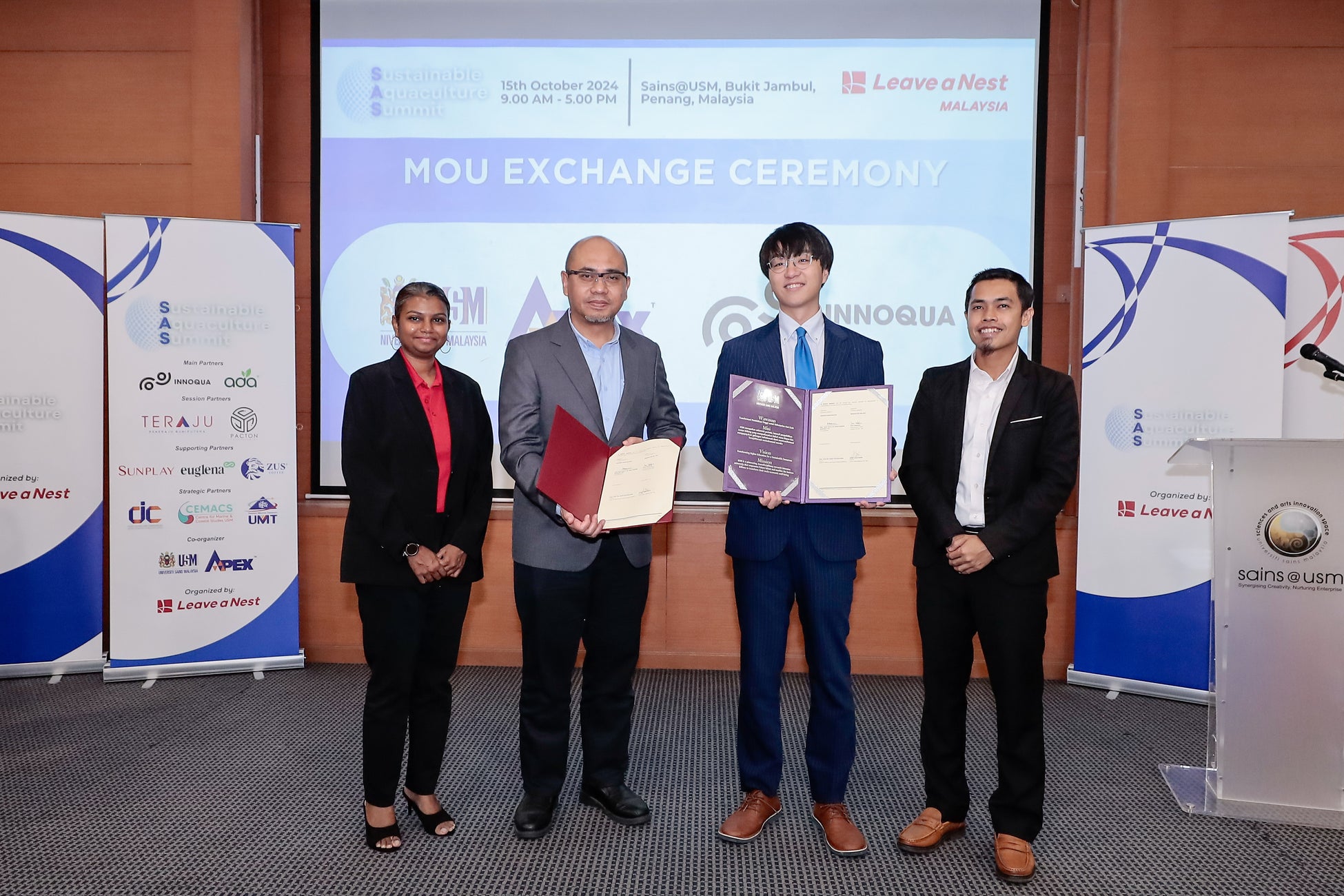 調印式は、株式会社リバネス(本社:東京都新宿区、代表:丸幸弘)が主催する「Sustainable Aquaculture Summit」の一環として行われました。式典には、USMの Centre for Marine and Coastal Studies (CEMACS) のディレクターである Prof. Dato’ Dr. Aileen Tan Shau Hwai 氏、Leave a Nest Malaysia Sdn. Bhd. のマネージングディレクター Abdul Hakim Sahidi 氏の立ち会いのもと、USM副学長 Professor Dato’ Ir. Dr. Abdul Rahman bin Mohamed, FASc 氏とイノカアジアCEO 高倉葉太 氏が署名しました。