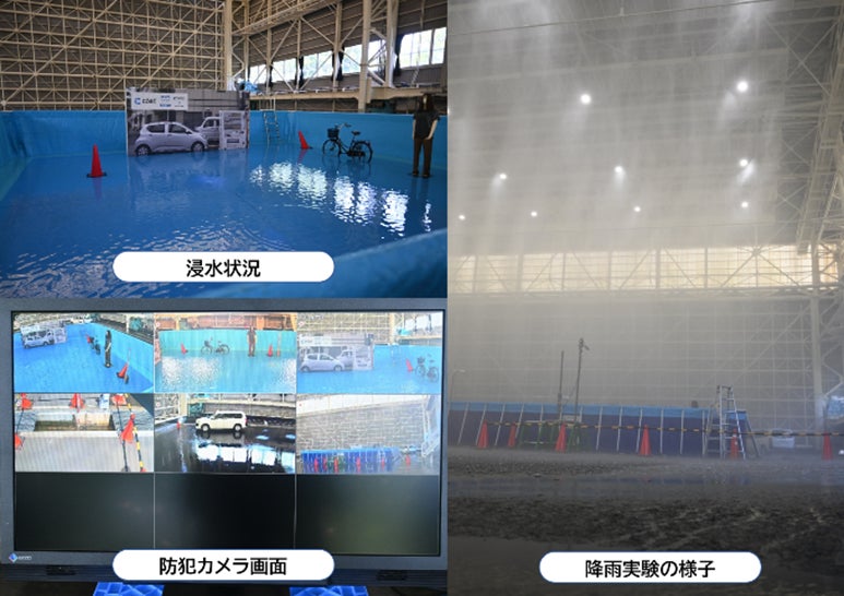 ① 実験施設内で時間雨量15mmから300mm(※5)までの降雨を発生させ、施設内に設置したプール内の浸水状況をセコムの防犯カメラで撮影してモニタリング。