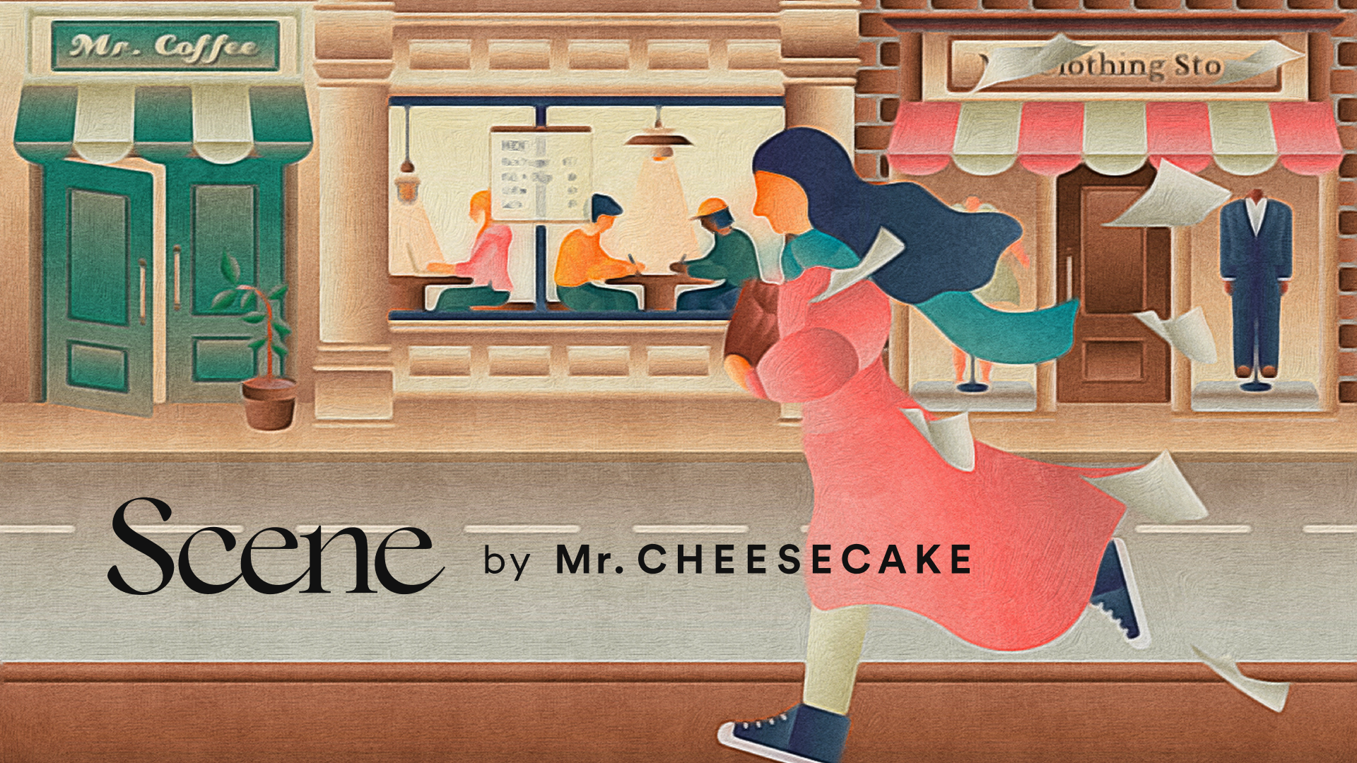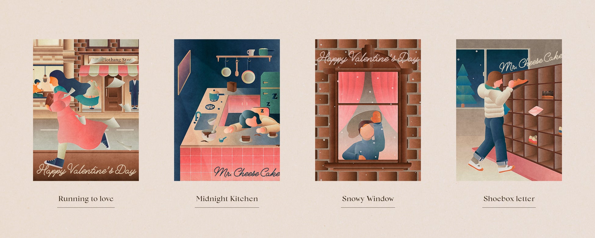バレンタインシーズンに登場するScene by Mr. CHEESECAKEは、イラストレーター・新井リオ氏とのコラボレーションデザイン。溢れる想いと共に駆け出す様子や、手紙を書く様子など、大切な人を想うシーンを描いた4つのイラストから好きなデザインをお選びいただけます。