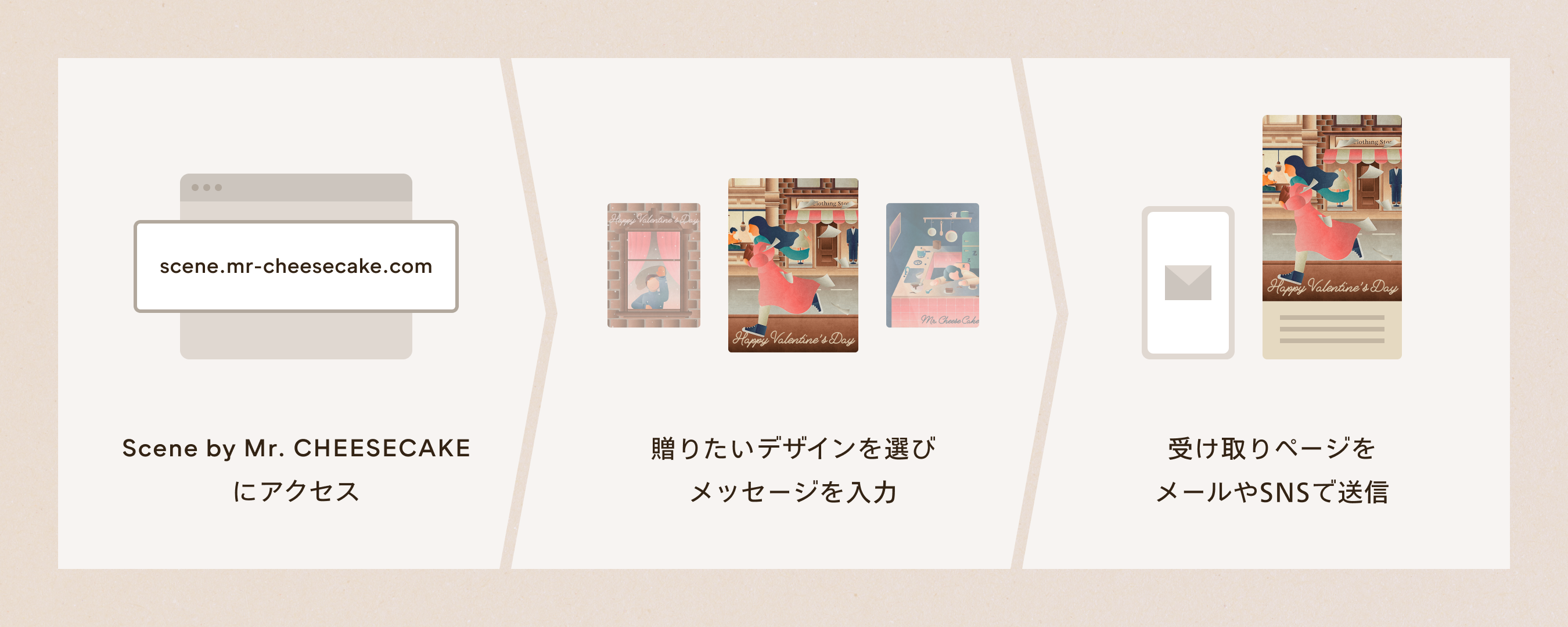 「Scene by Mr. CHEESECAKE」は、記憶に残る日常を「言葉の贈り物を通じて大切な人に届けてほしい」という想いを込めて誕生した新サービスです。会員登録は不要でURLを共有するだけで、誰にでも気軽にデジタルグリーティングカードを贈ることができます。また、本サービスはオンラインで手軽にギフトを贈れる「Mr. CHEESECAKE eGIFT」との併用も可能です。