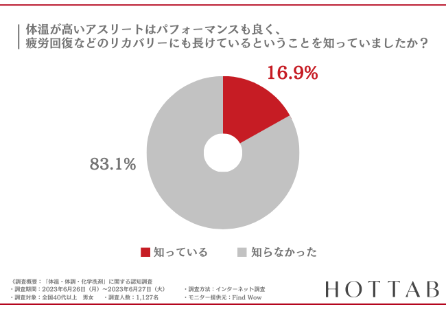 今回の調査では、「体温が高いと、疲労回復やリカバリーにもつながりやすく、活躍するアスリートは高パフォーマンスを発揮している」ことに関して、認知調査を行ったところ、80%以上の方が「知らなかった」と回答。