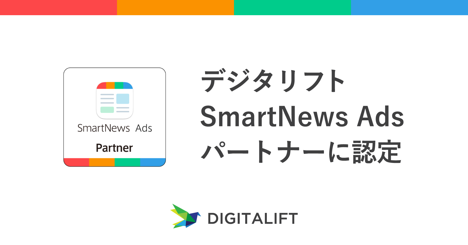 この度デジタリフトは、スマートニュースの広告商品取り扱い実績を認められ、「SmartNews Ads パートナー」の認定を得ることができました。これにより、個別の営業支援をはじめとする各種サポートを優先的に受けられるなど、一層クライアントの「SmartNews Ads」に関する課題の解決にコミットすることが可能となりました。デジタリフトはこれまでも、様々な媒体で認定代理店であり続けることはもちろん、Cookie対策支援やYMAA団体認証ゴールドマークの取得など、最新テクノロジーや時代の変化にいち早く適応しながら、柔軟な再設計機能と着実な実行体制の運用で、企業のマーケティング活動をサポートしてきました。